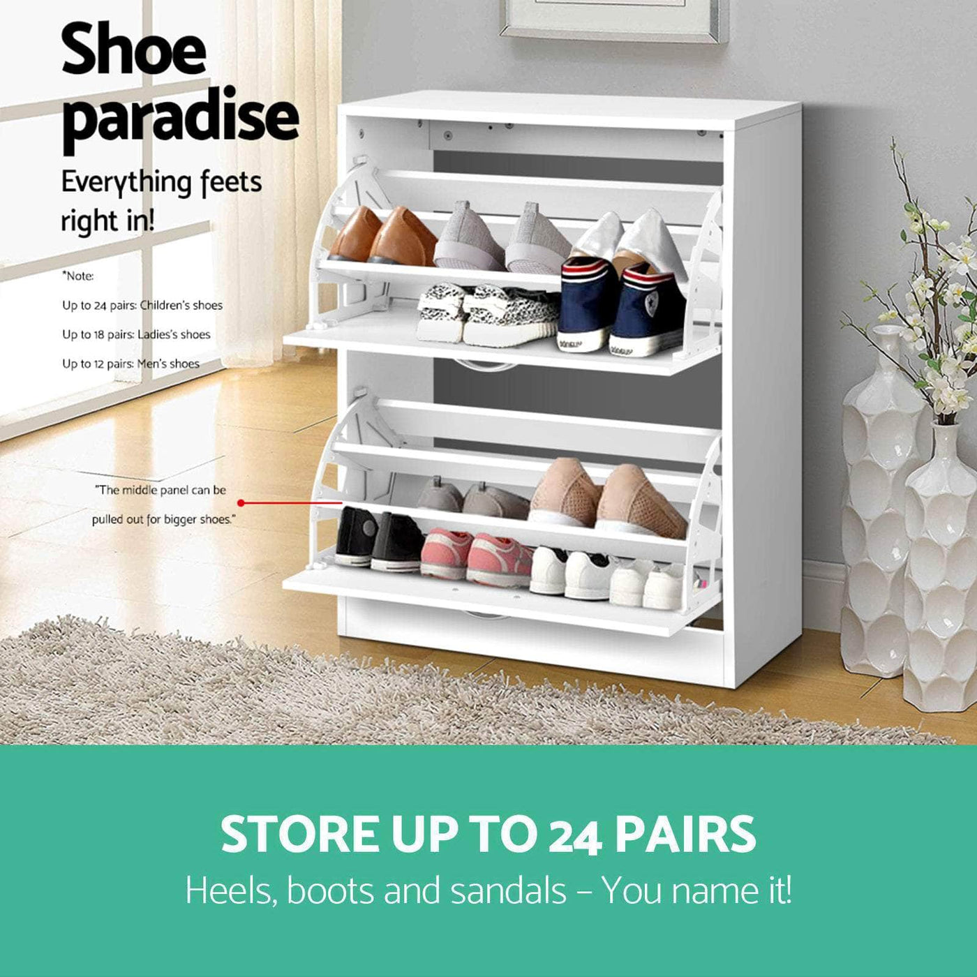 Stores up to 24 pairs (depends on shoe size):
