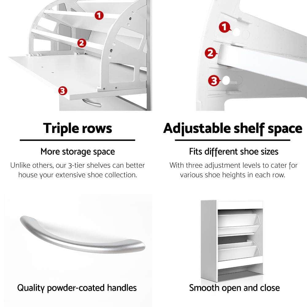 Designed with 3 adjustable level shelf space, you can fit different sized shoes or heels in the designated row. Making it effortless to get from and put back tidily everytime after used. With 3 rows per compartment, there are plenty space for your shoe paradise.
