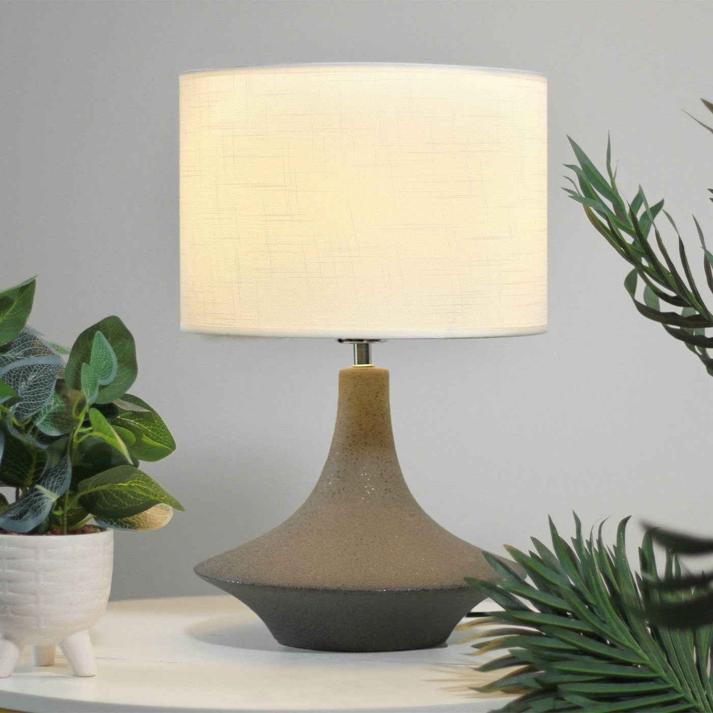 The sleek and curvy Symfonisk Desk Lamp oozes class and style, featuring a conical matte black ceramic base with a fine gloss fleck, supporting a white cylindrical white fabric lampshade that creates a modern noir aesthetic.