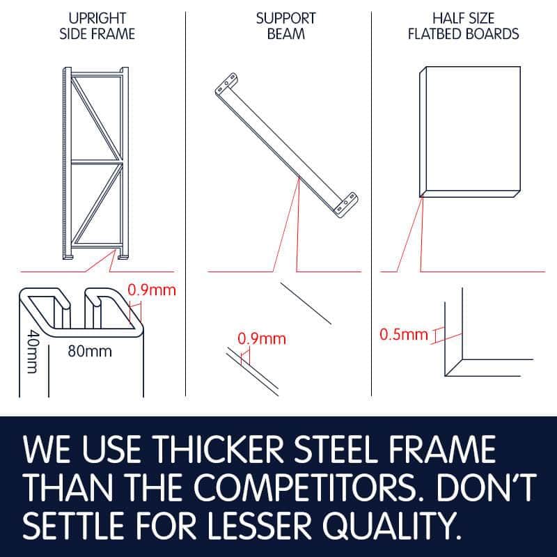 L-Shaped cross beams give you superior strength and durability for all loading purposes and provide a secure locating slot for the shelf panels. The beams are precisely engineered to dimensions that ensure the shelf panels slot in place at the right height to give an even loading surface.