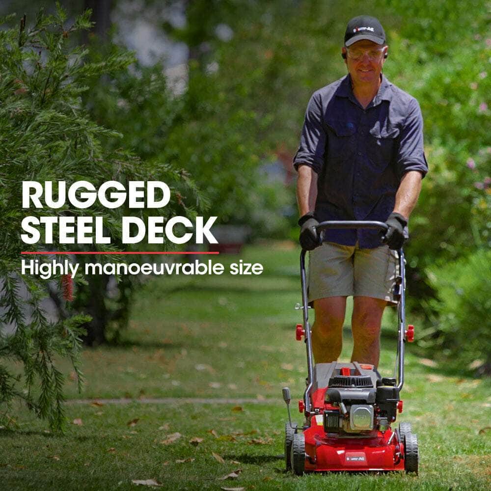 The Baumr-AG 720SX lawn mower boasts an effortlessly powerful 139cc air-cooled, 4-stroke OHV engine, that slices through the toughest buffalo with ease.