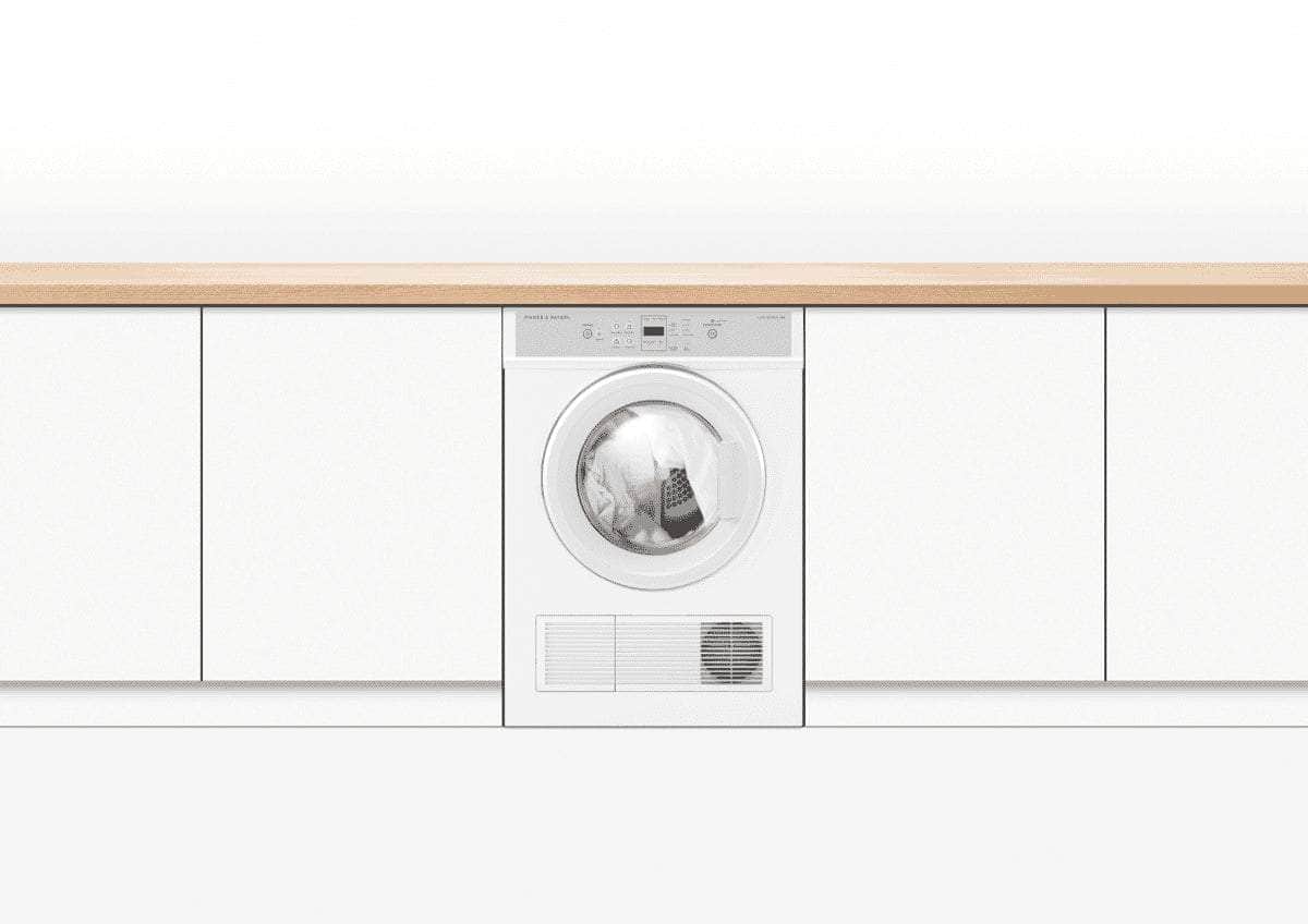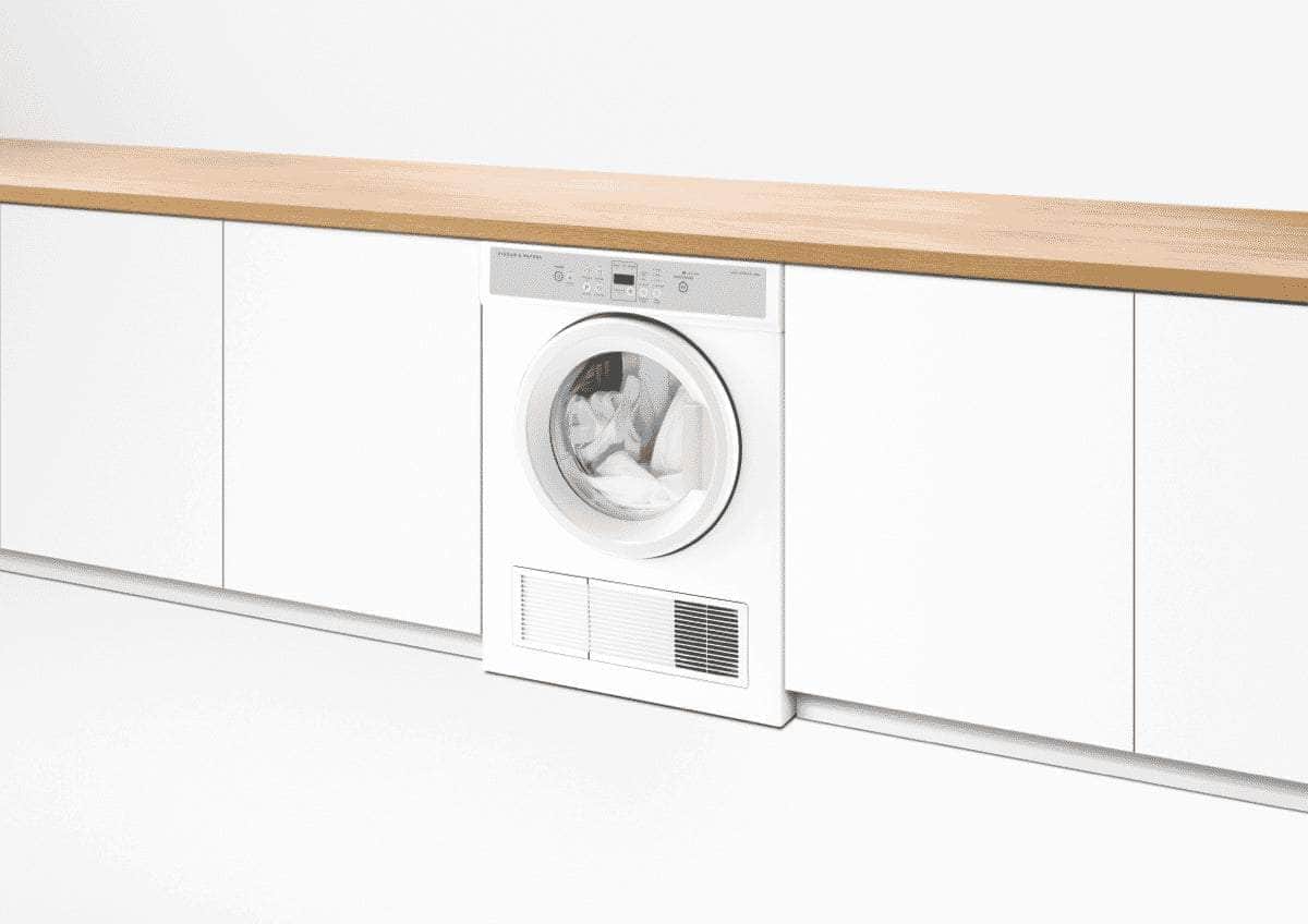 This white Fisher & Paykel vented dryer has the capacity to dry 6 kg (1kg the weight of one dry towel), which is perfect for households of one or two. A vented dryer is the most affordable type of dryer to buy for those who are on a budget (however running costs are higher), and outside ducting is needed to send the moist air outside via a hose, or the dryer needs to be placed in a really well-ventilated room. Its 4 types of drying programs enable you to program each load of laundry for the best results. Plus, the white Fisher & Paykel DE6060M2 has reverse tumbling, delicates, and heavy-duty programs. It has a delayed start setting and a 2 star energy rating. This white vented dryer is 830mm high, 600mm wide, and 575mm deep, so measure your laundry carefully to ensure it will fit, remembering to leave the space needed for the vent.