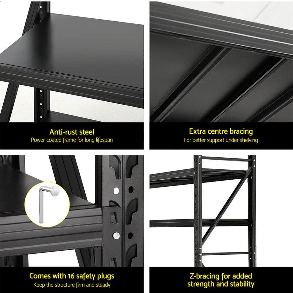 Looking for a heavy-duty shelving unit that does the work confidently and still looks modern and sturdy? Look no further than the Giantz Warehouse Shelving Unit which can hold up to a massive 200kg per shelf. Thats the equivalent weight of an average gorilla sitting on one shelf! Besides the gigantic weight capacity, Giantz shelving units are built with industrial-strength steel with added Z-bracing to hold and keep the structure firm and steady when fully loaded. The anti-rust coating keeps the shelves sturdy and long-lasting. The unit is easy to assemble simply use a rubber mallet to tap the frame into place. The shelves are easily height adjustable so you can create your ideal set-up. Comes with 16 safety plugs to keep the frame stable and steady.