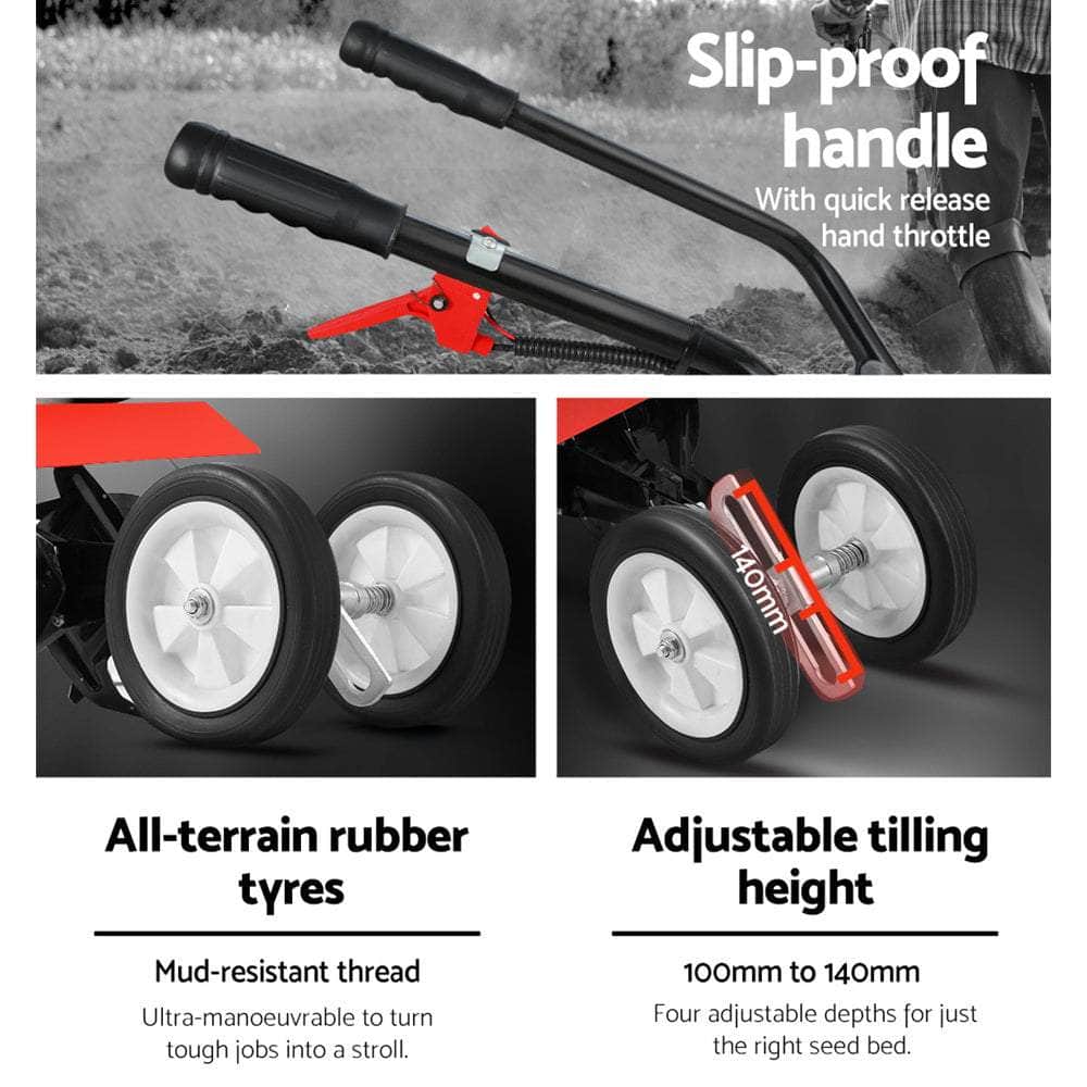 Get the earth moving quick and easy with the Hand-held Tiller. Featuring a 88cc 10,000rpm 2-stroke petrol motor, the tiller churns out soil deep and wide with its 16 teeth of hardened steel tines. The four blades allows you to till an extra-wide swath of 400mm and up to 150mm in depth. In other words, you only need one pass with the tiller to pulverise the soil and get the right seedbed for your favourite crops. Operating the tiller is just as easy with its pull-start improved engine, steady handle and quick-release hand throttle control and all-terrain rubber tyres to transform back-breaking tilling work into a ground-breaking stroll. And when the tilling is done, just fold away the tiller and store with the rest of your tools. Ideal for the home gardener or small-scale commercial grower.