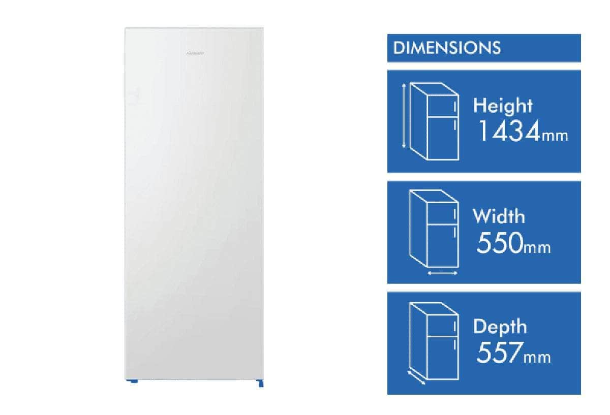 This Hisense upright freezer has a 155 litre capacity, so you can stockpile meats, homemade chicken stock for soups, and more. You can leave the defrosting to the appliance with its frost free design. Also, the Hisense HRVF155 has a 3 star energy rating and a white finish. It has a 550mm width, a 1434mm height, and a 557mm depth. This upright freezer is a good pick for always knowing what's in the freezer.