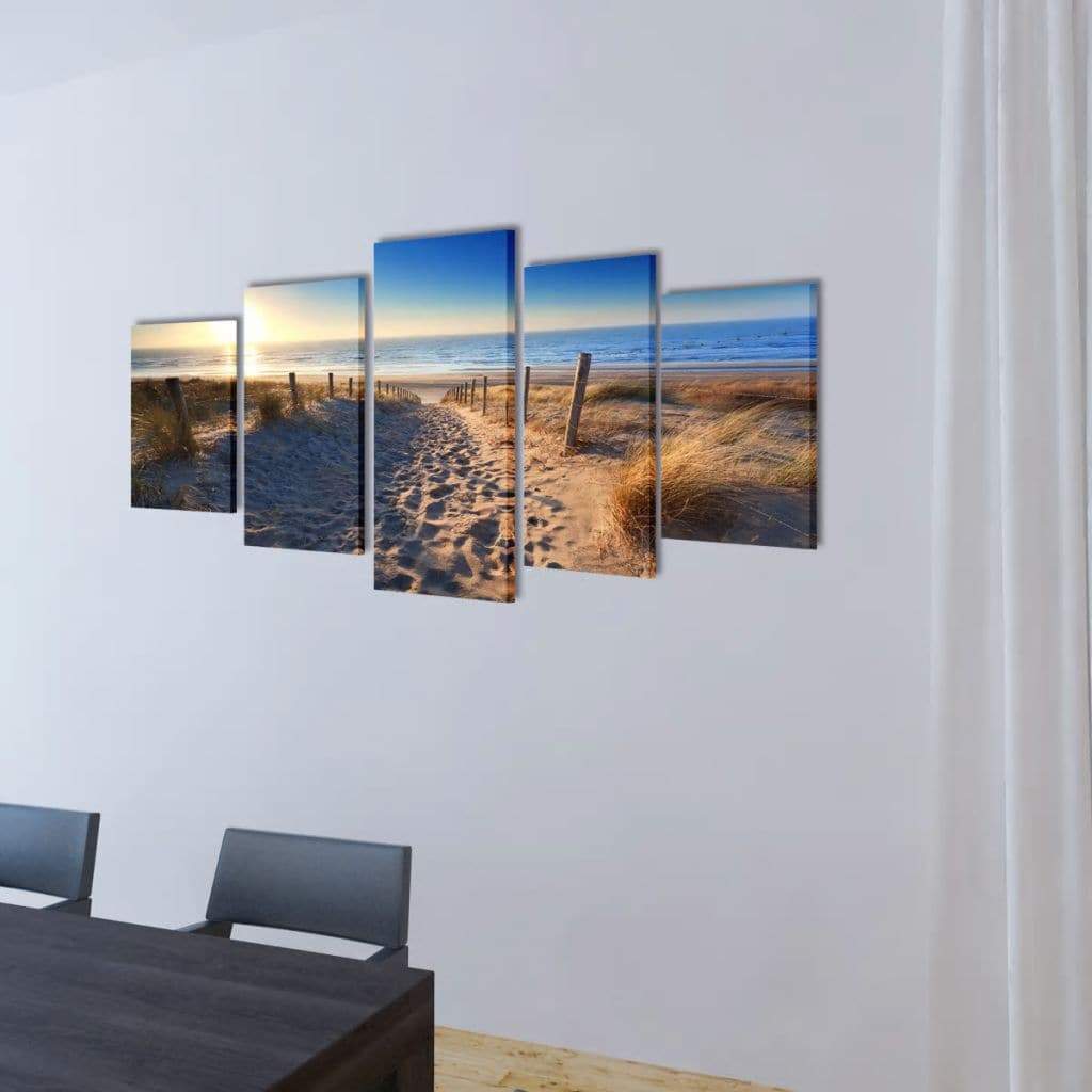 This 5-panel canvas wall print set will be ideal for decorating your living room, dining room, bedroom, etc. Made of high-quality canvas, this wall print set is waterproof and easy to clean. Thanks to the beach print, this wall print set has a tropical character. This canvas painting is ready to be mounted, no additional framing is required.