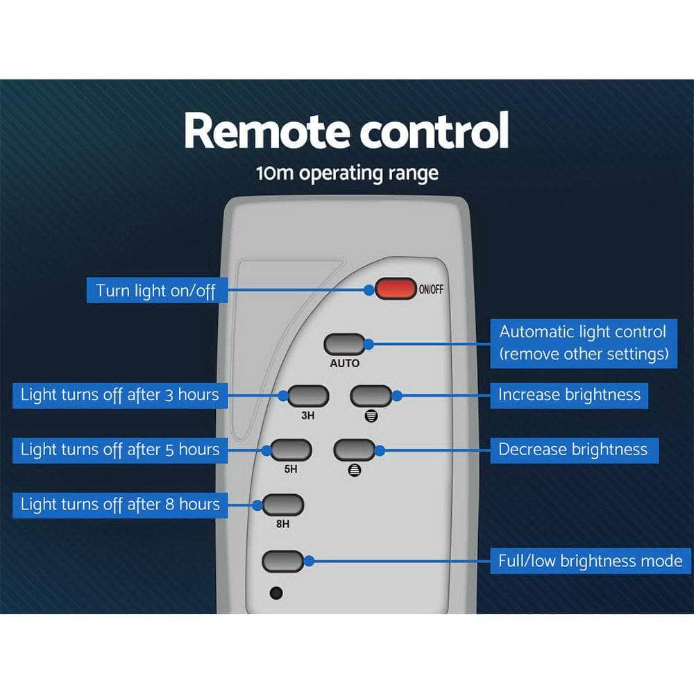 With its larger solar panel and powerful LED lights, our LED Solar Sensor Light shines brighter than most with even faster battery charging. It lights large areas using little power, thanks to the reflector which allows the LEDs to appear six times brighter and the fully automatic and intelligent light control system. The light sensor works to automatically charge the solar sensor light during the day and light it up at night, while the radar motion sensor turns the light up to full brightness when movement is detected and down to dim light at other times. And with the included easy-to-use remote control, you can set the mode to auto or adjust the timer and brightness to suit your requirements.