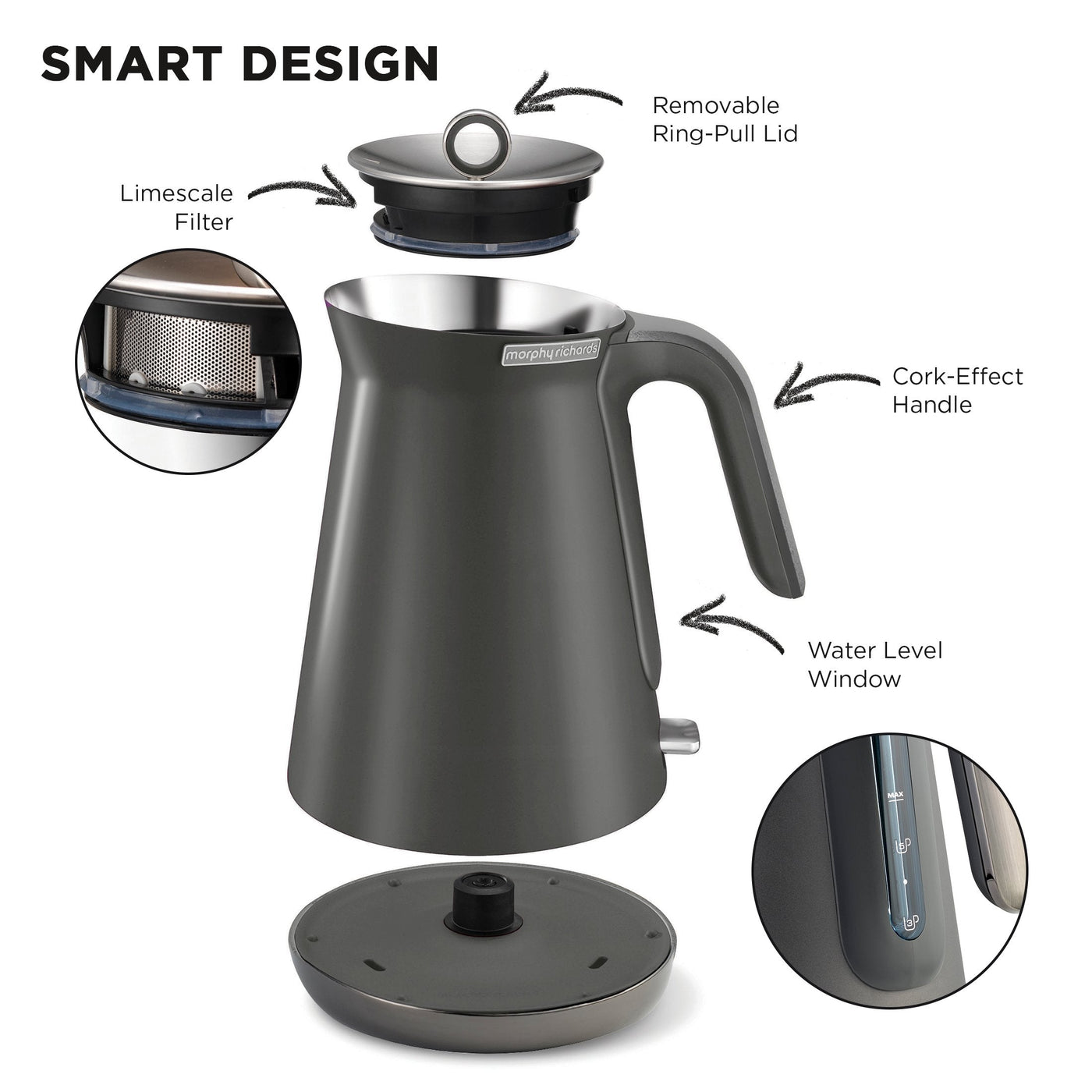 Complete the designer kitchen of your dreams with the Morphy Richards Aspect Kettle. Sleek and stylish, this modern kettle is made unique by its matte finish and black chrome trim. It has a distinctly minimalist look to complement a wide range of kitchen interiors.