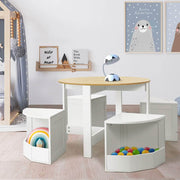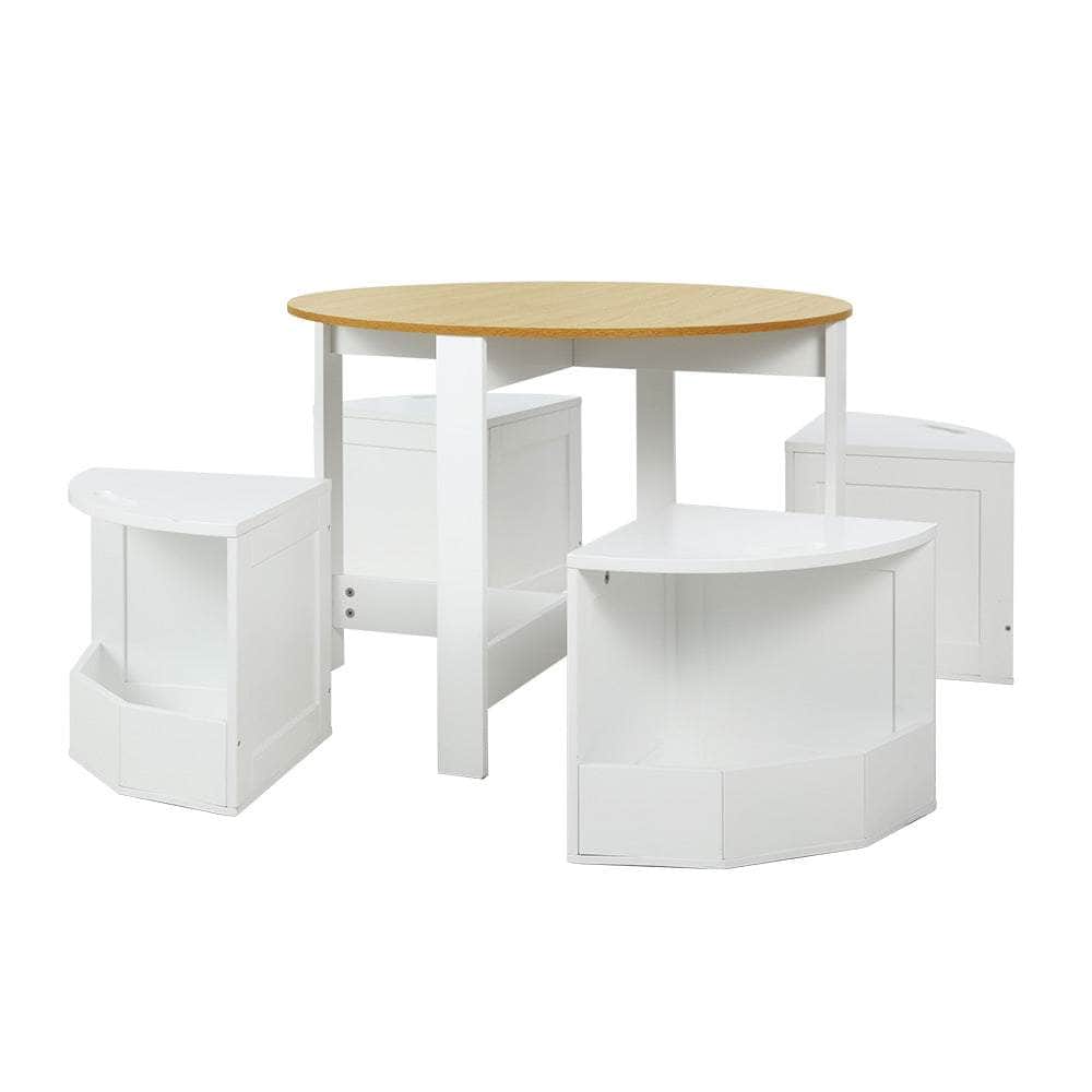Create a creative zone for your kids to play, create, learn, and eat! Our Keezi kids'5PCS table and chair set makes a perfect nook for your little ones to play, show off their creativity, do homework, and have meals like a grown-up. This gorgeous ensemble is extremely versatile and sure to add a creative touch to your kid's room with its creative integrated design. Featuring a child-safe and convenient design, this set features sturdy MDF board construction for durability and for stability. The eco-friendly and non-toxic paint and smooth round edges make it safe for kids. This set flaunts a space-saving design with round wooden tabletop and white exterior structure and chairs can be completely pushed inwards to save space. The chairs have built-in spacious storage compartments that allows you to store and hide away your kid’s toys, books, and other stuff. Our Keezi kids' table and chair set comes with four chairs and a wide table that allows your kid to play with mates comfortably. They have good weight holding capacity, which makes them extremely safe and versatile to use. Watch your kids have limitless fun and more giggles with their playmates!