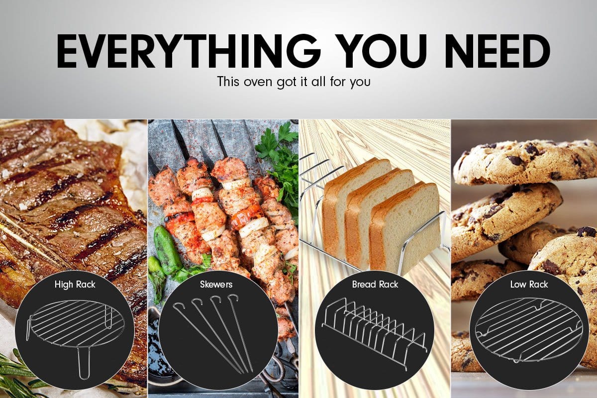 Package includes Stainless steel extender ring, low rack, high rack, tongs, bread rack, skewer & operation manual.