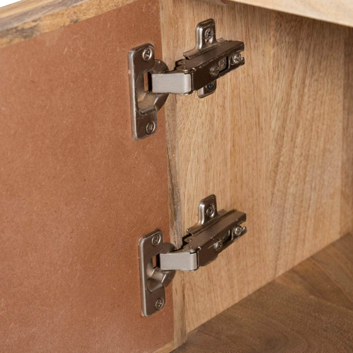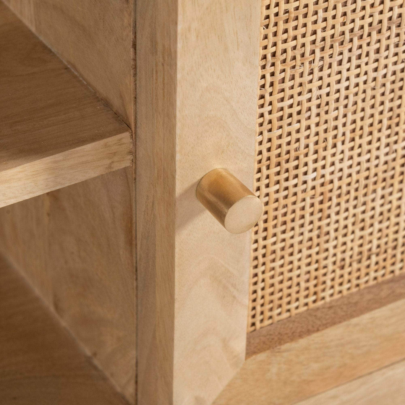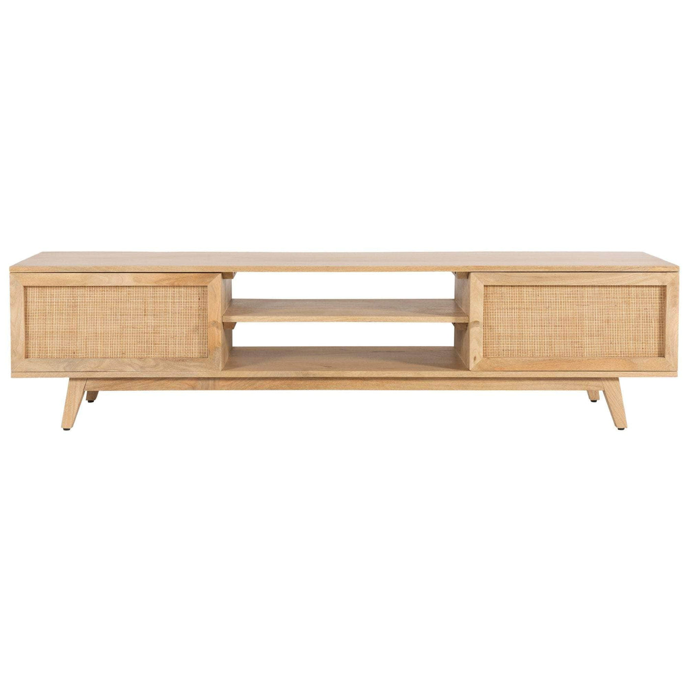 This 2-door TV Unit is a furniture marvel that displays visually appealing natural aesthetics. It is a beautiful furniture piece with 2 niches open on both sides that looks lovely in the living room. Made of sustainably harvested mango wood, the TV Unit has gorgeous rattan weave on the door fronts. Mango wood is valued for its robustness, longevity, and resistance to mould or moisture. Adjustable hinges, magnetic latches, and solid brass metal handles add to the practical functionality of the doors that cover sizable compartments. Attractive tapered legs made of solid timber provide a sturdy base for the TV Unit. Designed in a contemporary style, the furniture piece brings a sense of cosiness and warmth to your living area as you place your entertainment devices on it. The natural colour makes it suitable to complement diverse interior decor styles or furniture pieces. The easy-to-assemble TV Unit comes with a one-year warranty.