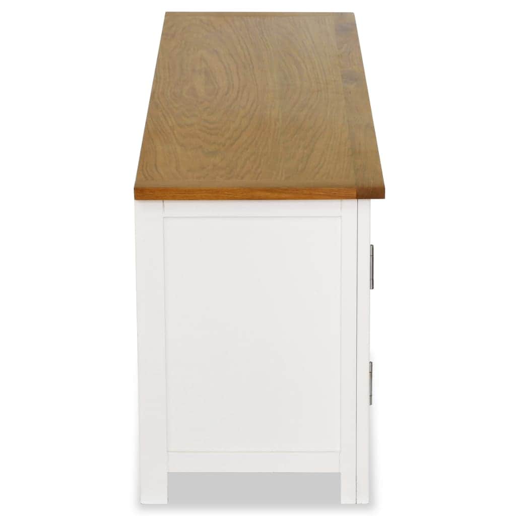 Our two-tone wooden TV cabinet will bring a touch of elegance to your home decor with its timeless design. The TV stand has a solid oak top, which adds to its sturdiness and durability. The oak has beautiful wood grains that give the furniture a touch of natural charm. The body is made of solid pinewood with a white finish and boasts a contemporary style. The TV stand has 2 cabinets and 2 compartments, providing ample space for keeping your multimedia appliances, books and other items. Thanks to the cable outlets at the back, you can neatly keep all wires out of sight. This product needs assembly.