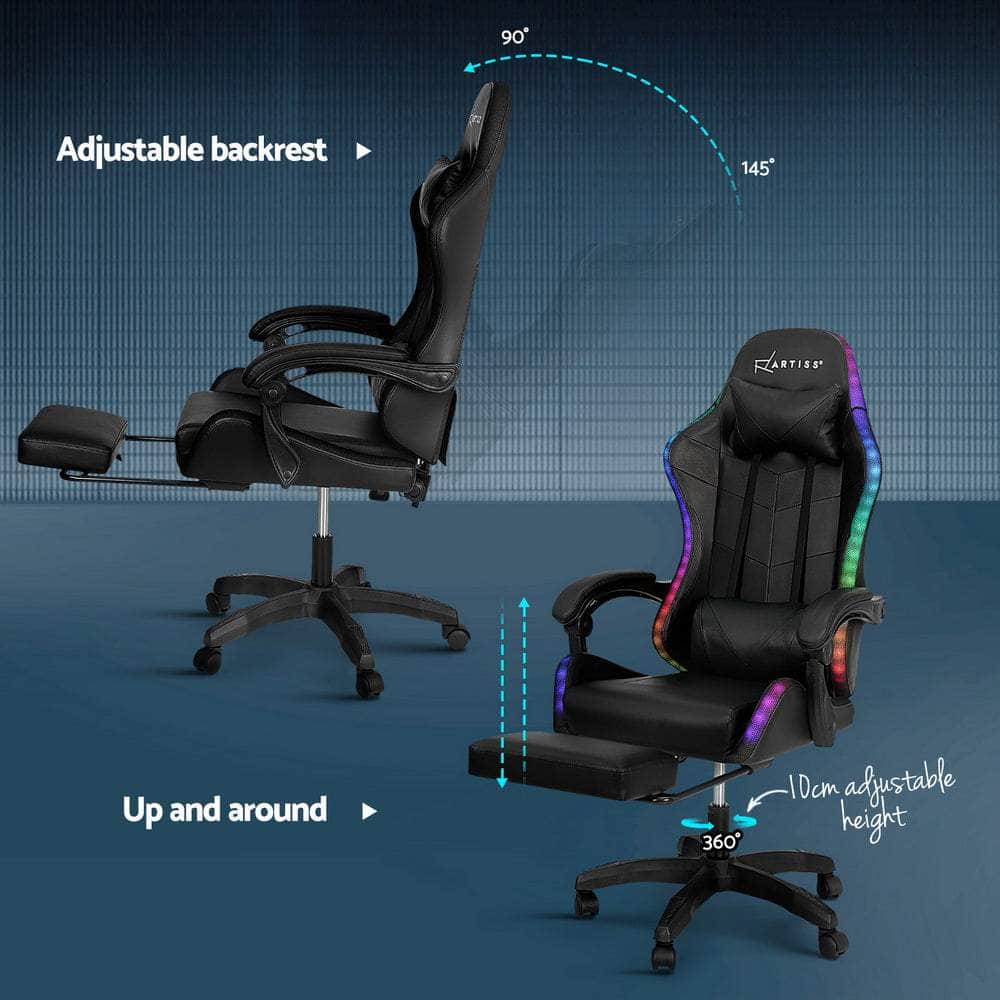 Now you can get a comfy massage from the comfort of home with the Massage Gaming Chair. It features an ergonomic design with full body support, premium PVC leather upholstery, high-density sponge padding and a sturdy nylon base. The racing chair style design encourages proper posture and airflow, perfect for gamers or anyone wanting to add extra flair to their home office. It uses premium gas lift components for easy height adjustments and can tilt up to 135 degrees for that perfectly comfortable position. For your relaxing massage, the chair features 6 massage points at the lower back, lumbar cushion and thighs, perfect for sitting back and relaxing. The headrest is removable and adjustable and the chair also features a retractable footrest so you can customize your comfort. The chair is flexible with 360-degree rotation, 10cm height adjustment and five dual-wheel castors for easy mobility. Best of all, 7 bright LED colours will help to light up your space in a dynamic display. No matter whether you're working, gaming or taking a long-desired break, the Massage Gaming Chair is here to provide premium comfort and support.