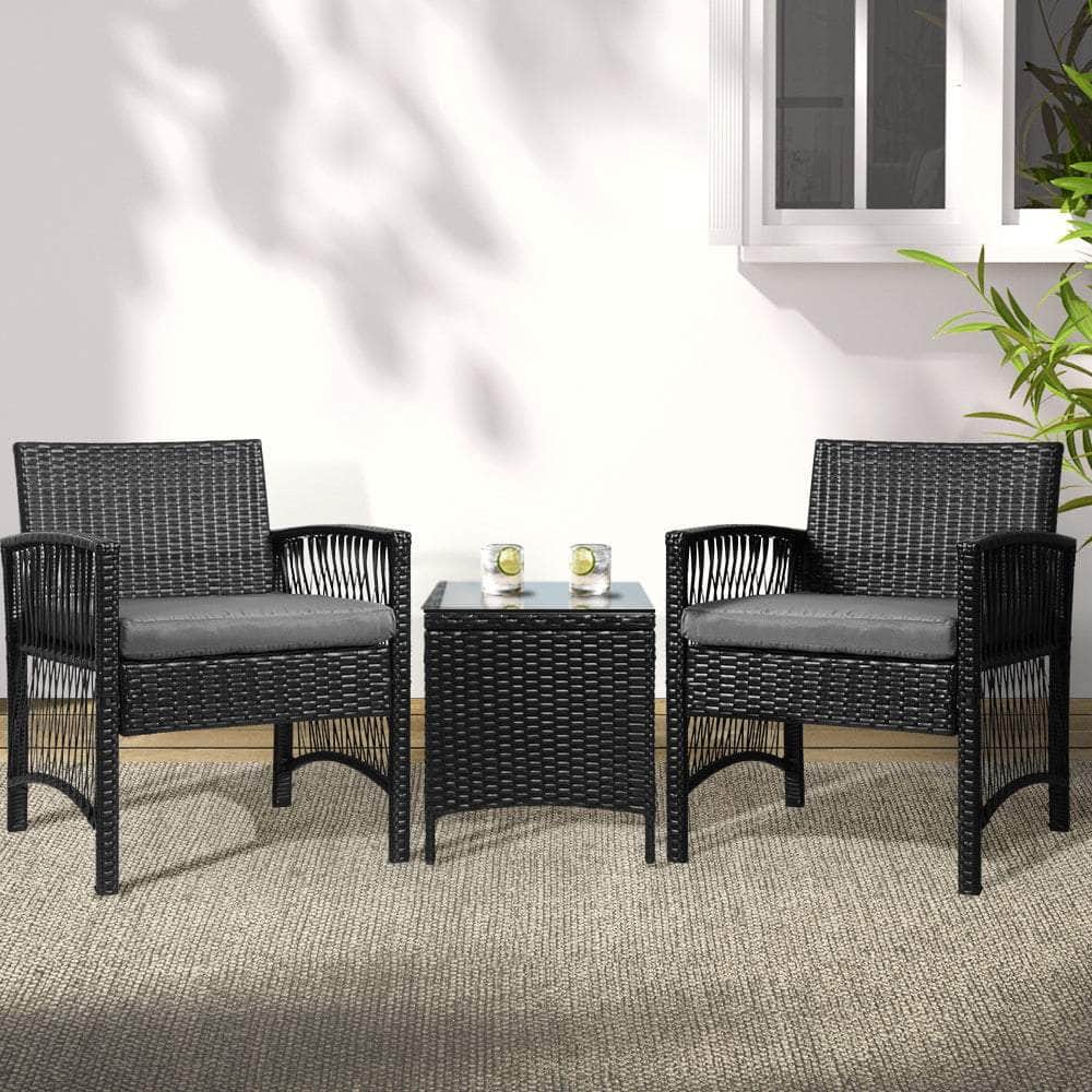 Enjoy the pleasant outdoors or have a nice chat with friends over a cuppa with our 3-pc Outdoor Set. With its chic and trendy profile, the set comes with two chairs and a matching table. Finished in meticulously weaved UV-resistant and weather-resistant PE wicker with a strong and sturdy galvanised steel frame construction for both chairs and table, this outdoor set is designed to please as well as stand up to the weather elements. The chairs have an elegant harp-inspired design with 5cm thick high-density foam cushions to ensure comfort and style are always in place. If you spill your drink, the 5mm thick tempered glass tabletop and removable seat cushion covers make cleaning up hassle-free. With so much going for it, the outdoor set certainly deserves its coveted space in your lovely backyard, deck or patio. Or even indoors for a unique presence.