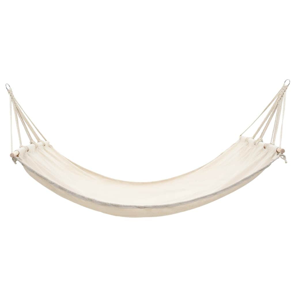 This large hammock allows you to fully relax in your backyard, the park or anywhere else you care to place it. The hammock is made from cotton and polyester in a lovely cream colour. With its large surface area the hammock is perfectly usable for two people at the same time. The wooden bar prevents the hammock from turning over and it preserves the large surface area when you use it. The hammock is equipped with two metal loops, so it is easy to mount to a tree or a hammock stand.