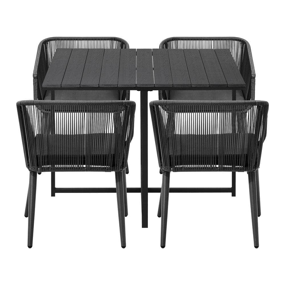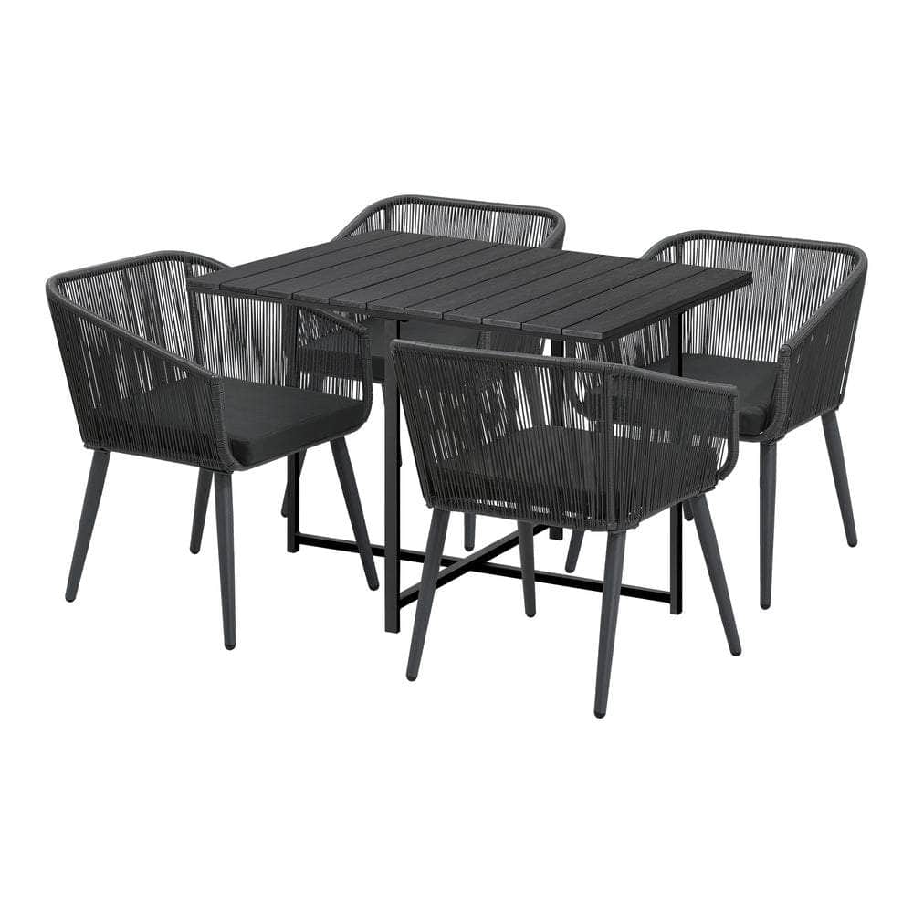Living life to the fullest. Chilling out under the sun, moon and stars. Alfresco dining with friends, family or just with your precious me-time. Simply pursuing and enjoying life that is meant to be. And the Outdoor Dining Set is ready to be there at home with you. Stylish. Contemporary. Beautiful. For the dining table, a unique composite wood/plastic top with a natural wood grain finish. And for the dining chairs, equally attractive pieces that go well with the table. The set has all the attributes of chic outdoor furniture that resonate with your discerning lifestyle. Have your lattes, your favourite brews and savour delectable cuisines and other gastronomical delights. Eat, drink and be merry! But how does the dining set stand up to the harsh and sometimes fickle Australian weather? No worries mate as it is all weather-resistant, chairs and table, with strength and durability for robust use. Not least, this dining setup also looks fabulous with any indoor eclectic styling ideas that you may have. Convinced that this delightful outdoor package is for you? Click on the Buy option and soon you ill be feasting to your (and many others too) heart is content at the Outdoor Dining Set day and night, night and day, in every season.