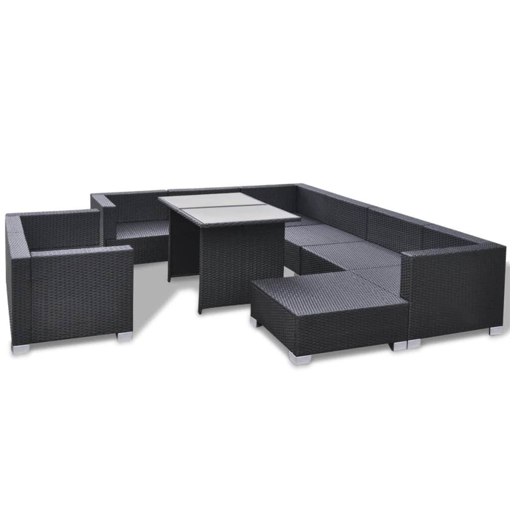 This rattan dining lounge set combines style and functionality, and will become the focal point of your garden or patio. The whole furniture set is designed to be used outdoors year-round. Thanks to the weather-resistant and waterproof PE rattan, the lounge set is easy to clean, hard-wearing and suitable for daily use. The dining lounge set features a sturdy powder-coated steel frame, which is highly durable. It is also lightweight and modular, which makes it completely flexible and easy to move around to suit any setting. The thick, removable cushions are highly comfortable and easy to wash. Delivery includes 5 corner sofas, 3 centre sofas, 1 ottoman, 1 dinner table, 9 seat cushions and 9 back cushions and 4 throw pillows. Note: We recommend covering the set in the rain, snow and frost.