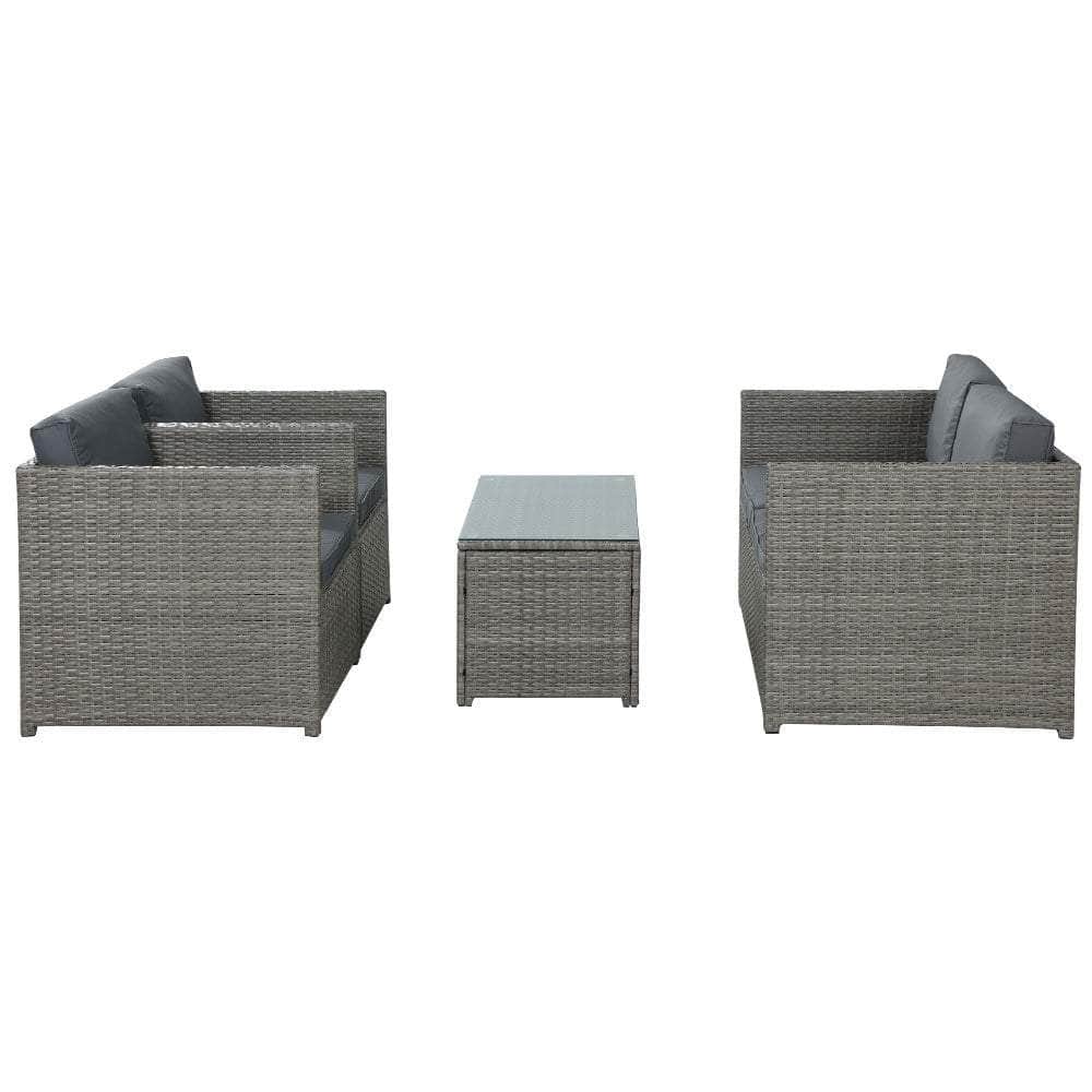 Looking to create a chic and gorgeous outdoor setting? The 4-piece wicker outdoor set is a must purchase. It will liven up your outdoor space and help you achieve an elegant space where you can enjoy day and night and summer and winter. This 4-seater set comprises of one two-seater sofa, two single sofas, and a matching centre table. Its beautiful and versatile design makes it perfect for indoor and outdoor use. All the seat and back cushions come with thick, high-density soft padding that ensures your comfort always. Additionally, the removable cushion covers are water-resistant to suit different seasons. Furthermore, our outdoor set features a lovely wicker weave for a touch of tropical charm, and the UV-resistant PE wicker with powder-coated and weather-resistant steel frame is suitable for all-season use. The large table with thick tempered glass top and durable frame ensures strength and durability, and the secured foot pads offers ultimate stability. This table also has anti-slip suction pads that prevents the tempered glass from slipping. This wicker outdoor set will withstand the test of time. You can create a praise-worthy spot with just a little creativity that will wow your guests. Shop it for your home today.