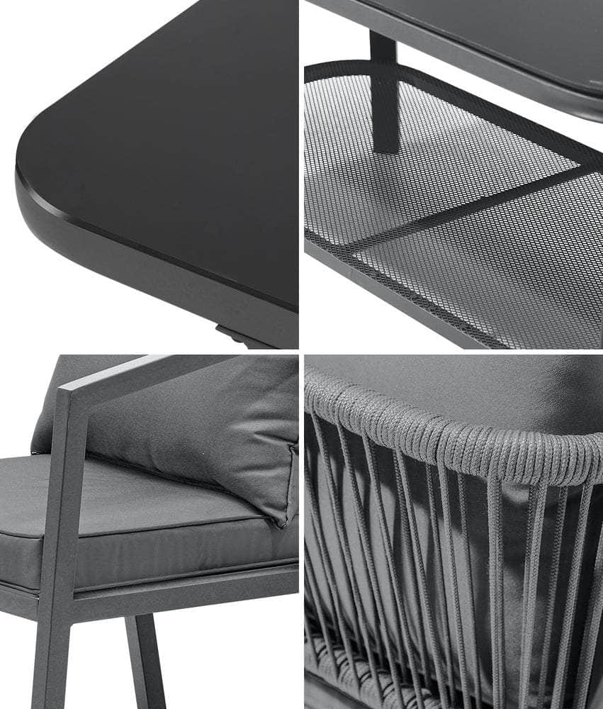 The set includes a spacious table with extra shelf storage, providing ample surface area for dining, entertaining, or simply enjoying a cup of coffee outdoors. The table is designed with a sleek and modern aesthetic, making it a stylish centerpiece for any outdoor setting. Its compact size allows for easy placement in smaller outdoor spaces, while still providing enough room for a comfortable dining experience.