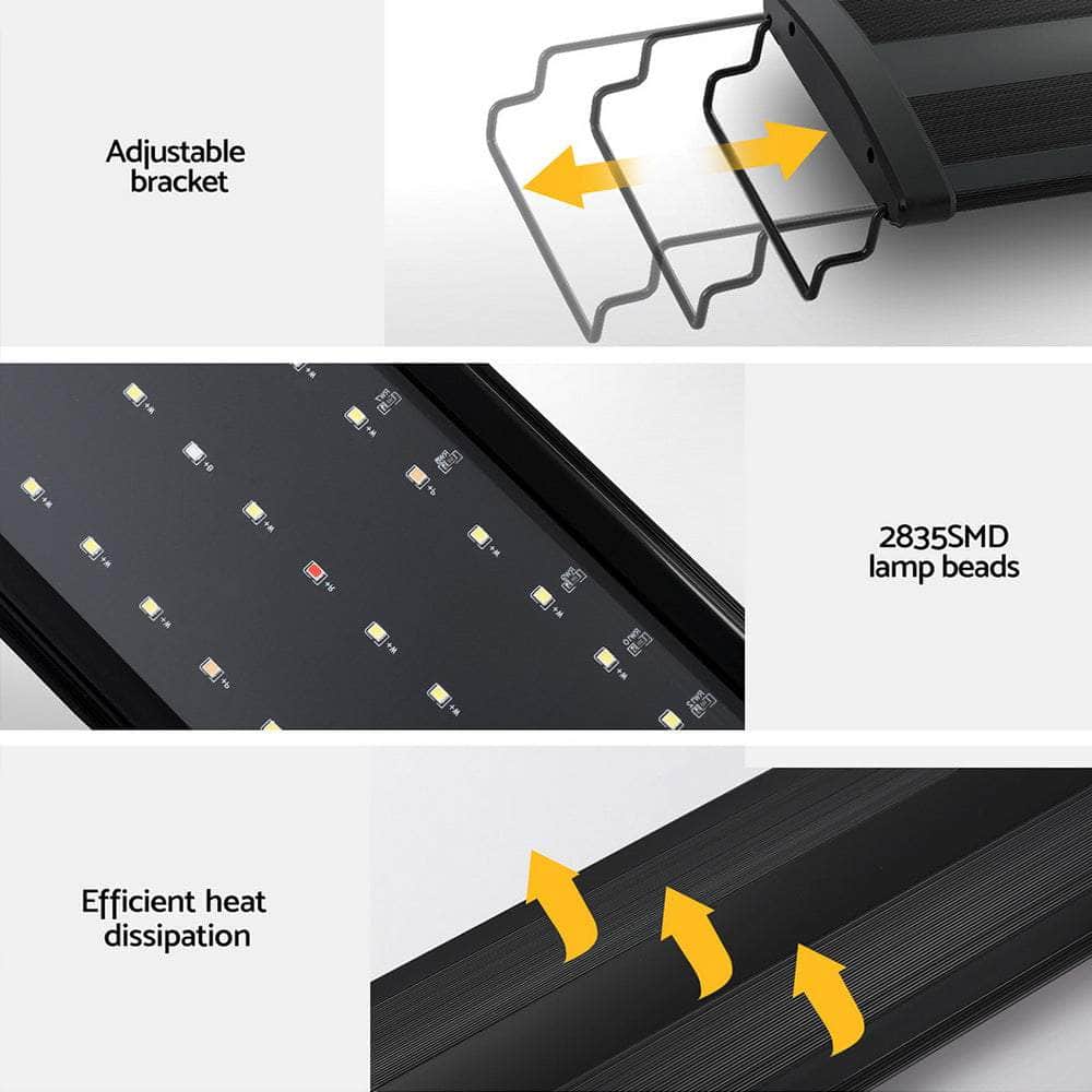Introducing our aquarium LED light, designed to enhance tank vibrancy with 5-colour LEDs. The adjustable bracket makes it suitable for various tank sizes, while utilizing efficient, cost-saving 2835 LED technology. This light is suitable for both freshwater and saltwater tanks.