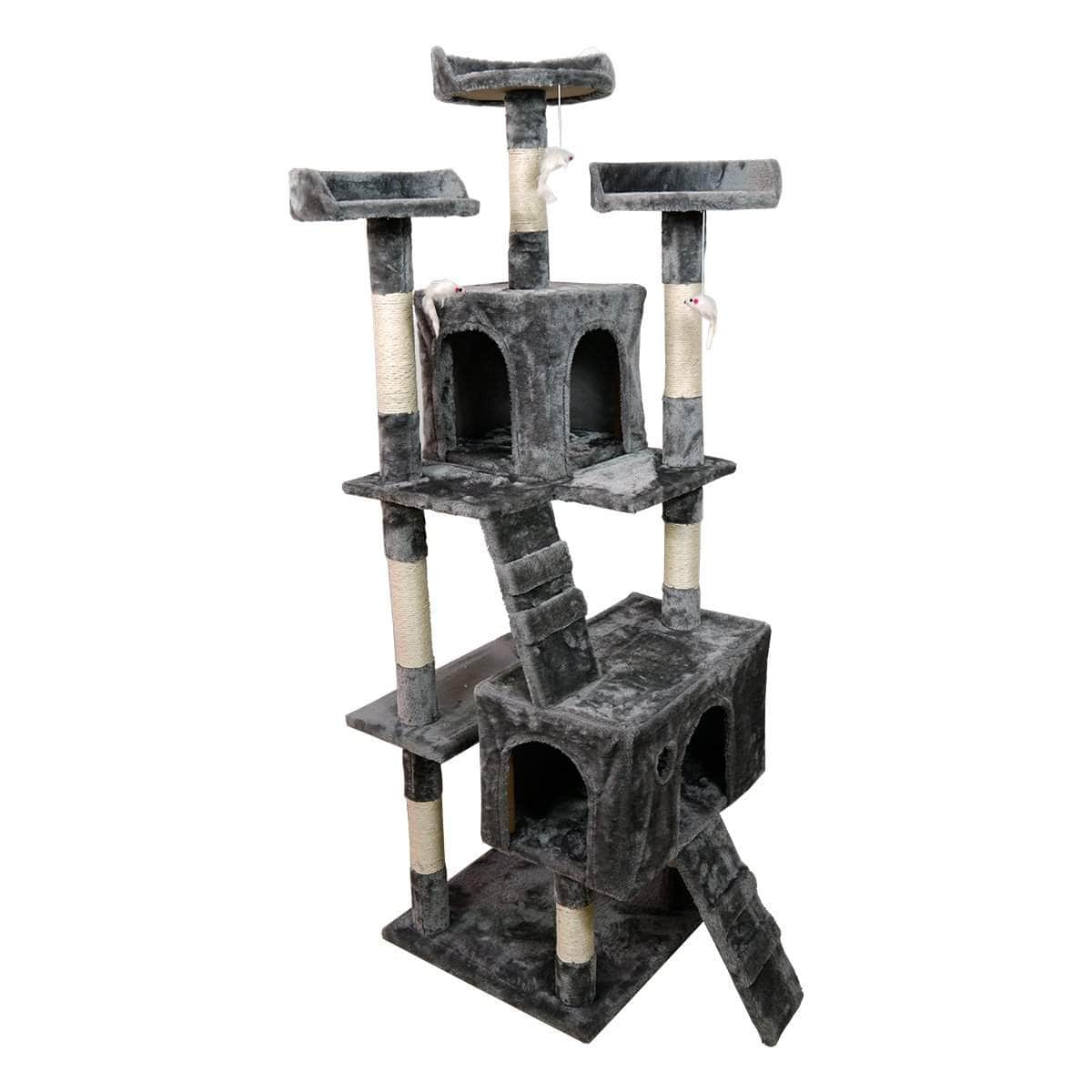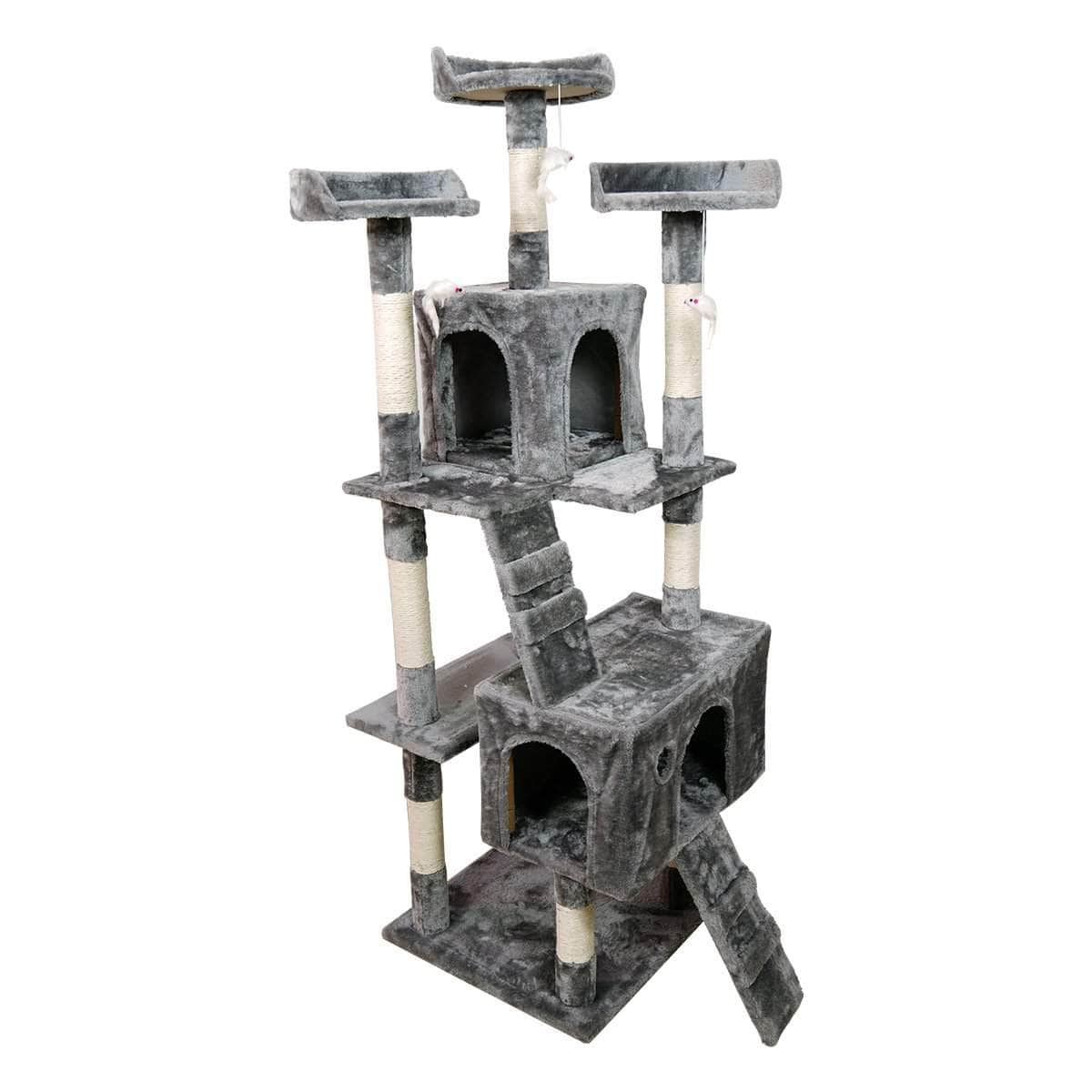 At 170cm tall, it features two cubby houses, two ramps and multiple shelves to perch, climb and nap on. The dangling toys right at the top provide a healthy outlet for your cats' hunting instincts. And the built-in scratching posts will let your cats sharpen their claws without damaging your rugs or furniture.