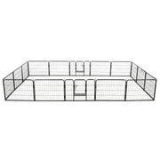 Our versatile playpen is ideal for your dogs to play, exercise, train or simply keeping them safe. It will be the perfect play paradise for your furry friends! This dog kennel can be easily set up or taken down. It consists of 16 heavy-duty panels and each panel can be easily attached to the next, which allows you to configure the playpen in different shapes. The dog enclosure features two hinged doors with security latches for easy access. This durable and weather-resistant dog playpen is made of rustproof powder-coated steel, making it suitable for outdoor and indoor use. The included ground stakes help secure the playpen outdoors for added stability and security.