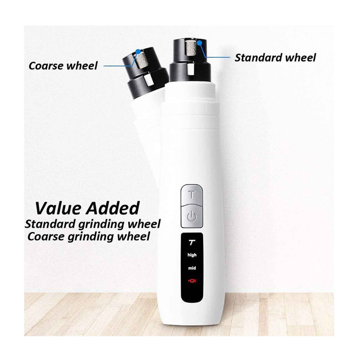 The cordless dog grinder is rechargeable and has an indicator blue light on the bottom that turns on when charging. Each grinder has a built-in battery that lasts 8 hours after a 1.5h charge. The lightweight and ergonomic body design also makes it easier to handle in your right or left hand.