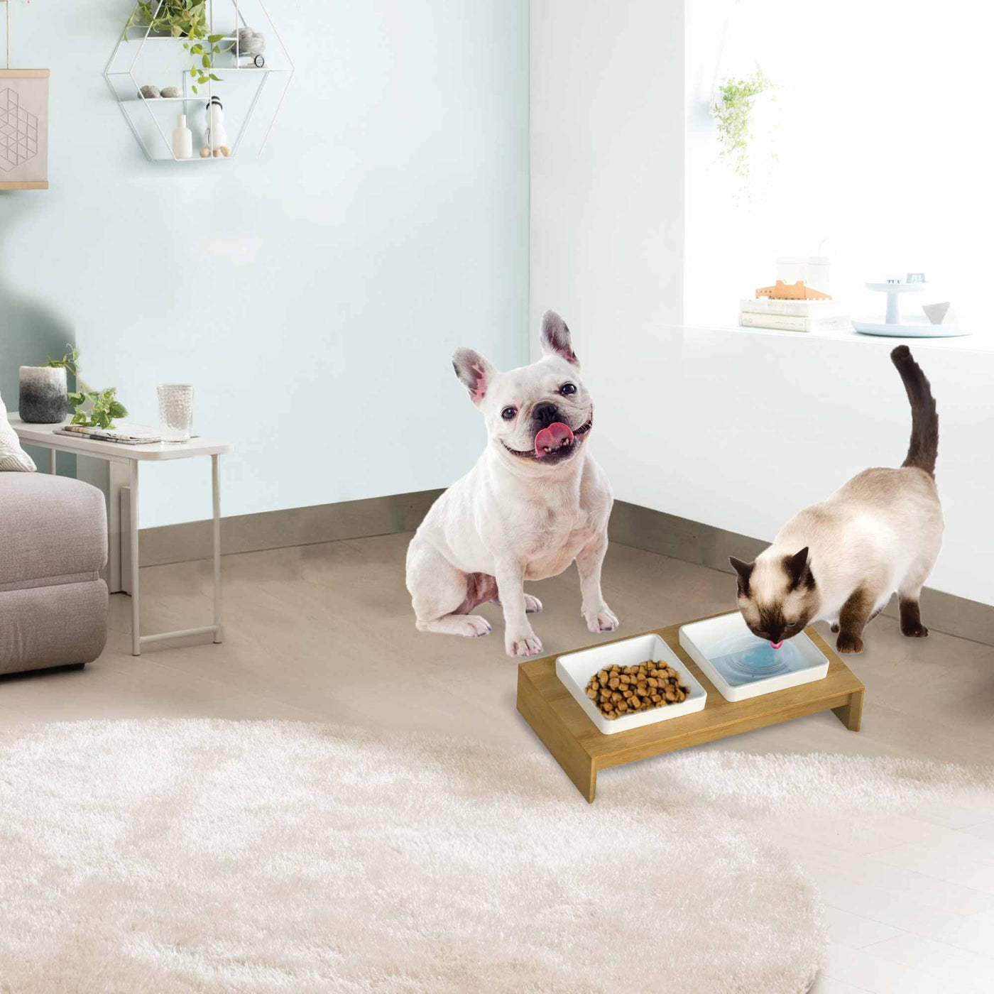 Stylish 2x200ml Pet Double Dinner Ceramic Bowl on Elevated Wood Base Dogs, Cats