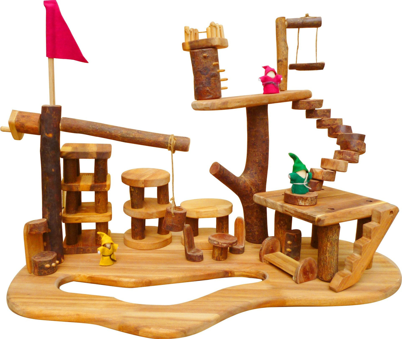 This tree house complex set will bring children to the imaginative world. The set is more than just a tree house. It is a play complex, a 'city' with buildings and houses playground, lakes... The set comes with 2 dolls and furniture too. Our tree toys series is made of Lychee wood ( recycled cut down trees when it is no longer productive for fruit harvest) and Acacia wood, using non toxic, child safe materials.