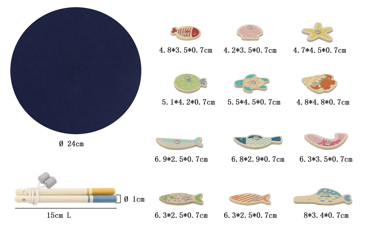 Magnetic Fishing Game with Natural timber fish finished with pastel non-toxic modern designs complete with navy blue felt pond.