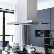 Our low-noise and powerful island range hood is ideal for effectively extracting smoke, grease, moisture and even heat from your kitchen. Its stainless steel housing gives your kitchen a stylish and modern look. This chimney hood is equipped with a 3-layer washable aluminium grease filter to protect the inside of the extractor hood and the exhaust pipe from grease. The built-in LED lights provide excellent illumination, to help with cooking and also to create a nice ambience in your kitchen. The extractor hood has 3 variable speeds to ensure you have a full control over the extraction rate and a charcoal filter that will help purify the air and release the cleaned air back into the kitchen, whilst external extraction transfers cooking odours to outside with the help of the included exhaust pipe. Assembly is easy. The island hood fits well in an open kitchen with a cooking island as a standalone hood, but can also be used if you do not have a cooking island.
