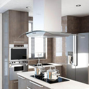 Our low-noise and powerful island range hood is ideal for effectively extracting smoke, grease, moisture and even heat from your kitchen. Its stainless steel housing is combined with a sleek, curved tempered glass canopy, giving your kitchen a stylish and modern look. This island hood is equipped with two 3-layer washable aluminium grease filters to protect the inside of the extractor hood and the exhaust pipe from grease. The built-in LED lights provide excellent illumination, to help with cooking and also to create a nice ambience in your kitchen. The extractor hood has 3 variable speeds to ensure you have a full control over the extraction rate and a charcoal filter that will help purify the air and release the cleaned air back into the kitchen, whilst external extraction transfers cooking odours to outside with the help of the included exhaust pipe. Assembly is easy. The island hood fits well in an open kitchen with a cooking island as a standalone hood, but can also be used if you do not have a cooking island.