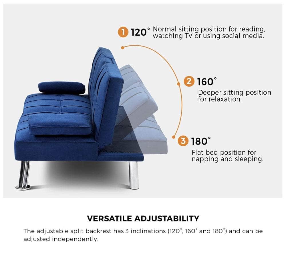 Equipped with three adjustable positions for the backrest, you can turn your sofa bed into the best seat in the house for watching TV, reading, or keeping up with your social media, or nestle it down for relaxation, napping or sleeping. Better still, the backrest can be adjusted individually to create a spilt backrest that lets you enjoy sitting and sleeping separately in one sofa. Plus, the middle backrest can also be folded down to serve as an armrest. Together with its built-in cup holders, the sofa is an all-in-one leisure centre. Need a cushion or pillow? Just detach the armrests (held down by Velcro) for instant comfort.
