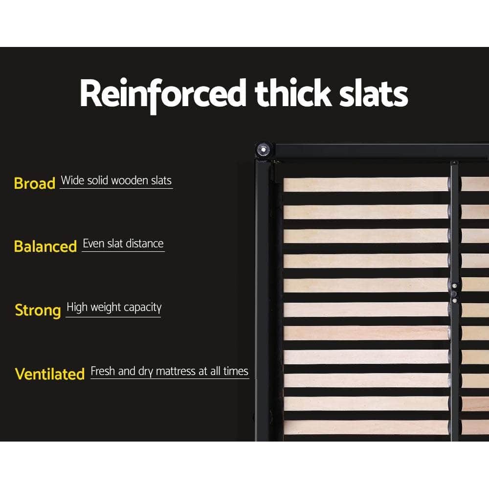 Constructed with a sturdy steel frame that's reinforced with metal bars and heavy-duty connectors, the Mila Bed Frame is also padded with high density foam and upholstered in premium faux linen fabric for a soft and comfortable touch. The Bed Frame features a wooden arched slat base that helps to distribute weight evenly across the frame and a centre support strut to provide added stability to the overall structure.