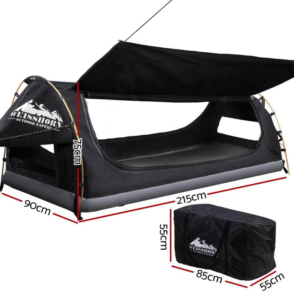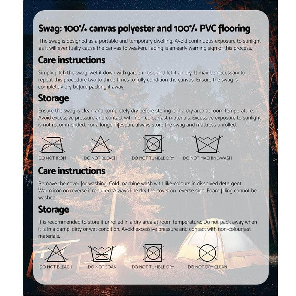 Camping and enjoying the great outdoors is no fun when your tent isnt holding up the way it should be. Think of those nights when it is just too hot, too wet, or too cold. When the creepy crawlies and flying insects have made themselves at home in your shelter. That is why you need our ever-reliable free-standing King Single Swag.