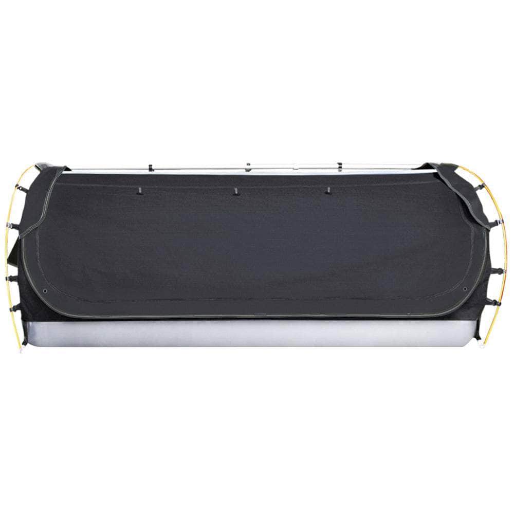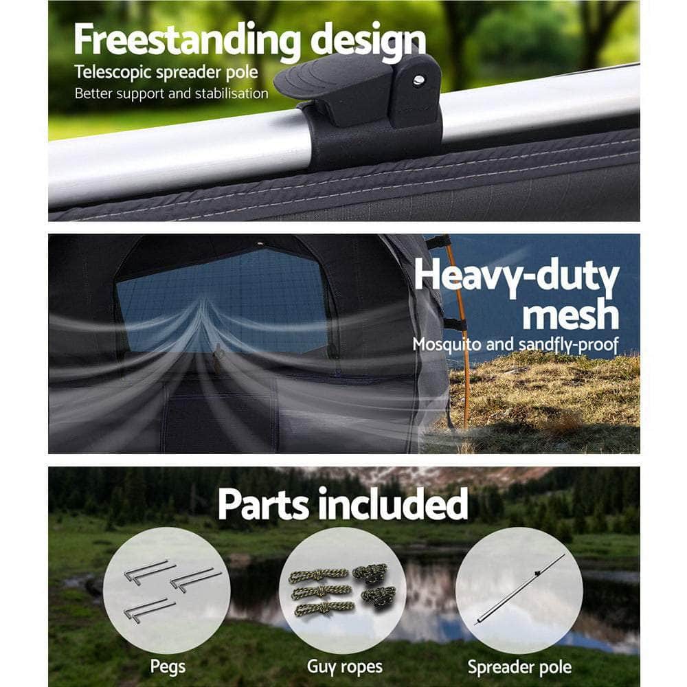A 12oz 380gsm water-repellent Ripstop canvas cover, 500gsm PVC flooring and 10cm high edges all round. Swagspeak for the ultimate tear-resistant waterproofing. Fully enclosed for privacy with zipped openings for fresh air anytime. Mesh panels to keep insects out.Thick aluminium support poles to hold up the entire set up.