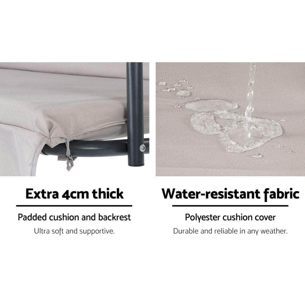 Made with a water-resistant and UV protected canopy, a sturdy power-coated steel frame and generously padded cushions, the swing chair offers the ultimate comfort in any weather. Set the shade in any position to provide the right cover or detach completely for relaxed sunbathing. The cushions and covers are removable for easy cleaning. Not least, the upgraded springs are designed to provide smooth motion coupled with reliable suspension.