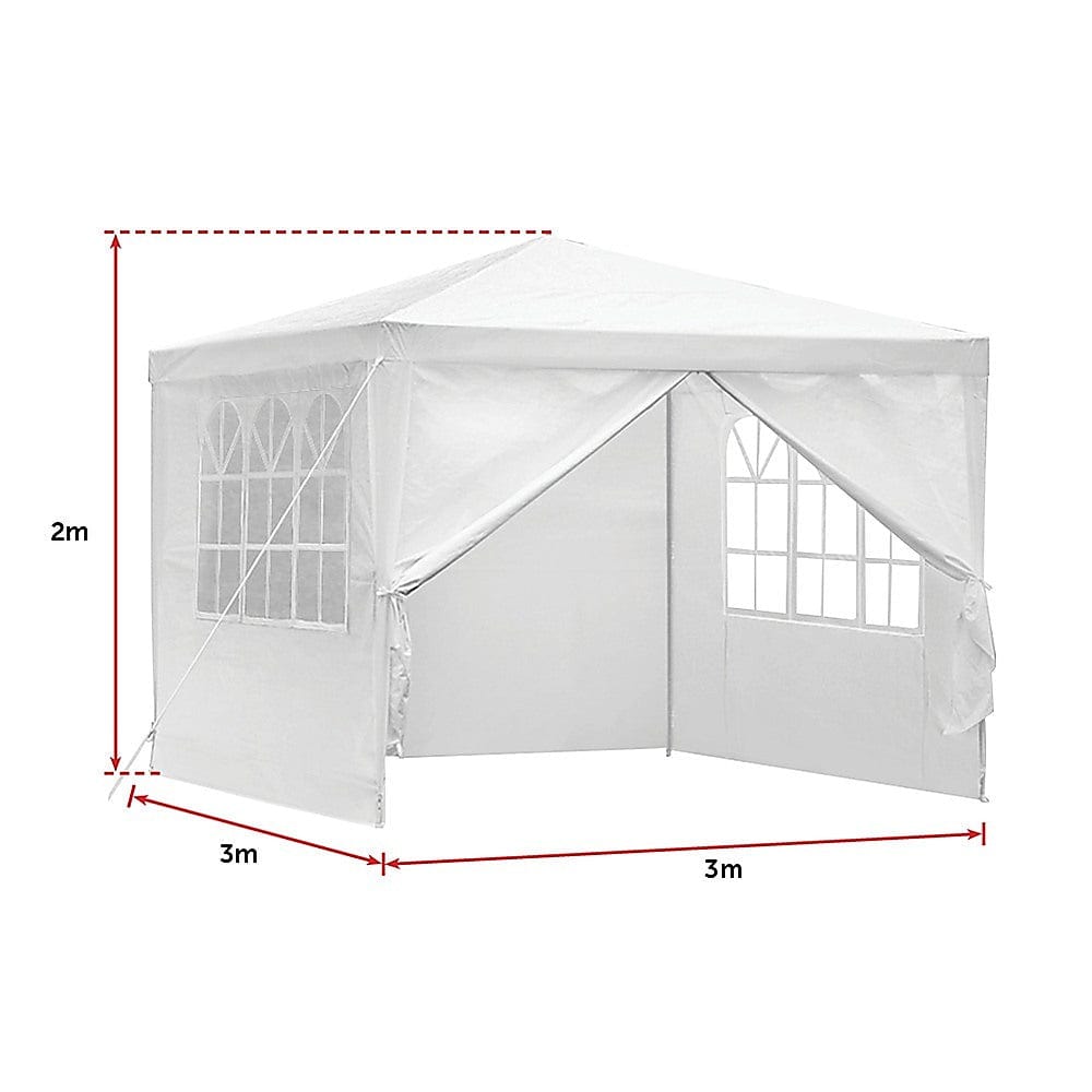 Featuring a thick steel frame and extra heavy-duty cloth material, the 3 x 3m Gazebo - White is built to last, and designed to withstand most any weather condition. Beyond the classic tent design, 4 walls are included - for added privacy, shade, and protection from the elements. These walls may be rolled up in order to suit your custom needs. The 3 x 3m Gazebo - White has the large dimensions, sturdy construction, and versatile wall features you need to beat the heat and make your next outdoor event a special one.