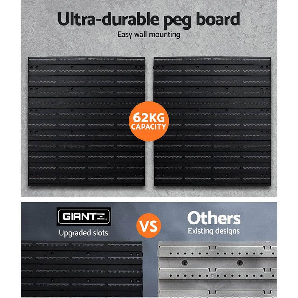 Are your tools always cluttering up your garage due to inadequate storage space? Well, now you can get more organised with our Tool Storage Rack. The rack is the perfect space-saving solution for storing your tools and accessories in your garage or storage room and makes it easier for you to find the rights tools when you need them. The two ultra-durable peg boards are simple to mount on the wall and feature an upgraded mounting slot design for extra stability in securing your tools. Then just insert the two shelves and fifty tool holders into the peg board slots for instant storage. The best part is that the tool holders are removable, so that you can easily change their layout on the peg board to accommodate future additions to your ever-growing tool collection.