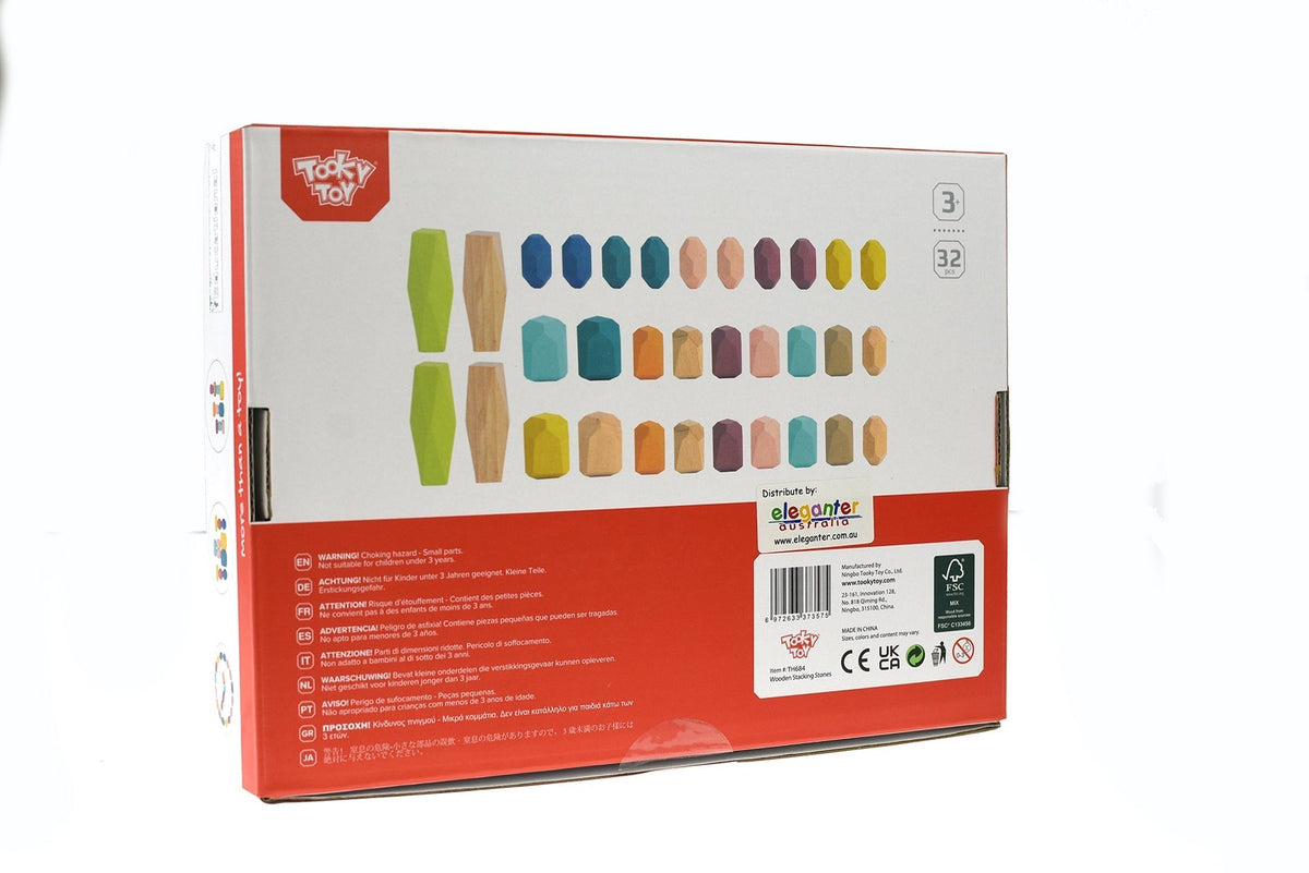 32 wooden piece set of natural and coloured stacking stones made from timber and painted in child safe, non toxic paint.