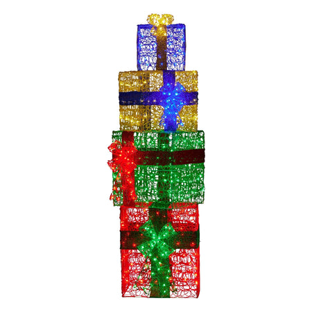 Create a dazzling holiday centerpiece with the Christabelle 190cm Light-Up 4-Piece Gift Stack Christmas Decoration. This four-piece gift stack brings festive charm indoors or outdoors, each box topped with a decorative bow and framed in a PVC-coated steel construction for durable, lasting appeal. Twinkling multicoloured dewdrop LEDs thread through every gift, delivering a bright, inviting glow.