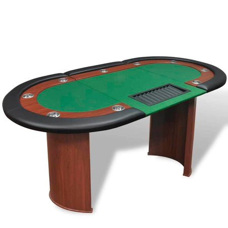 Enjoy the casino experience in the comfort of your own home and host exciting games for your friends every poker night with this fabulous poker table! The sleek poker table with a racetrack is equipped with a high-quality artificial leather armrest with extra thick, luxurious foam padding. It also has 9 built-in stainless steel cup holders to prevent spilling. The green padded felt playing surface is comfortable and level, and holds chips and cards in place. This poker table seats up to 10 players, and includes a dealer area with a chip tray that holds 500 chips. The chip tray is easily removable for cleaning. Thanks to the solid semicircular MDF legs, this poker table is very sturdy, stable and durable. Assembly is really easy.