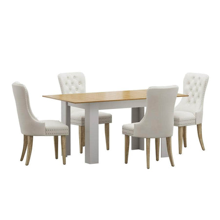 Immerse yourself in the timeless charm of our Dining Chair and Extendable Table Set, featuring sleek lines and a contemporary aesthetic that effortlessly enhances any dining area. Crafted with meticulous attention to detail, the design strikes the perfect balance between modern sophistication and enduring elegance.