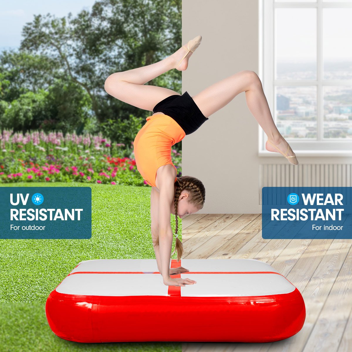 Great for gymnastics, cheerleading, gym sessions, fitness clubs and other high intensity sports, this inflatable mat block is an awesome training and competition landing platform.