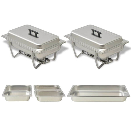 This set of 2 chafing dishes is very practical and ideal for keeping food warm or hot for prolonged periods. It is ideal for use in catering, restaurants, hotels, or parties or family get-togethers at home. Made of high-quality stainless steel, the chafing dish set has a solid construction and is easy to clean. The food pans have the standard "Gastronorm" dimensions, thus allowing universal use and a wide range of combinations. The water pans and food pans have rounded corners for easy cleaning. The lids have a heat-insulating handle and can be conveniently placed on the stand thanks to the 2 integrated hooks. With 2 handles on the stands, the food warmers are easy to move. The stands also have a shelf for holding the burners.
