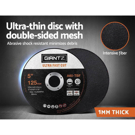 Quality DIY builds require quality tools, and you can't go wrong with Giantz 5" Cutting discs. Made from high-quality brown fused alumina, these ultra-thin discs are ultra-tough, perfect for cutting stainless steel and steel. The double sides mesh is shock resistant and minimises debris, and the stainless-steel centre ring allows for safer installation and clamp strength. With extremely low vibrations and a max speed of 80m/s, this disc makes a clean and stable cut every time. Specially formulated for angle grinders and at EN-certified quality, these cutting discs will last the life of your project and beyond. Comes in pack of 200.