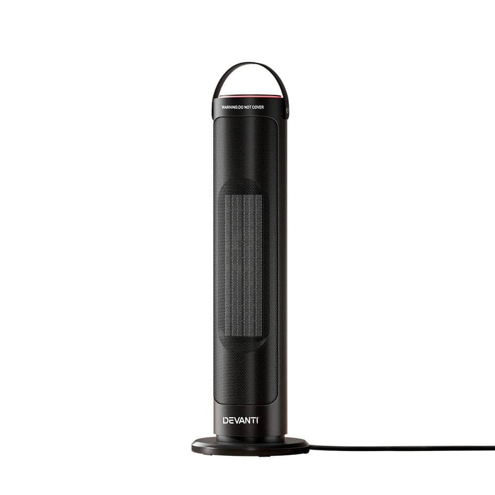 Need a little extra heating to get through winter? The Devanti Ceramic Tower Heater is here to solve your winter blues. With its high-quality rapid PTC heating system and fan system, the heater will have you warm in no time at all. It has four unique modes (fan, warm air, hot air and ECO mode) so youre always at the perfect temperature. The ECO energy-saving mode cycles low and high heat at 24 degrees to save on energy costs. It uses wide-angle oscillation to evenly heat your space. Easily control the heater with the top touch control panel: adjust the thermostat, oscillation and heating mode at any time. Use the nine-hour timer with auto shut-off to strategically heat your home and save energy. Best of all, the heater has built-in safety features such as an anti-scald protective mesh, a safety cut-off switch in case of tipping and overheating protection. For maximum comfort and warmth through the winter months, you cant go wrong with a Devanti Ceramic Tower Heater.