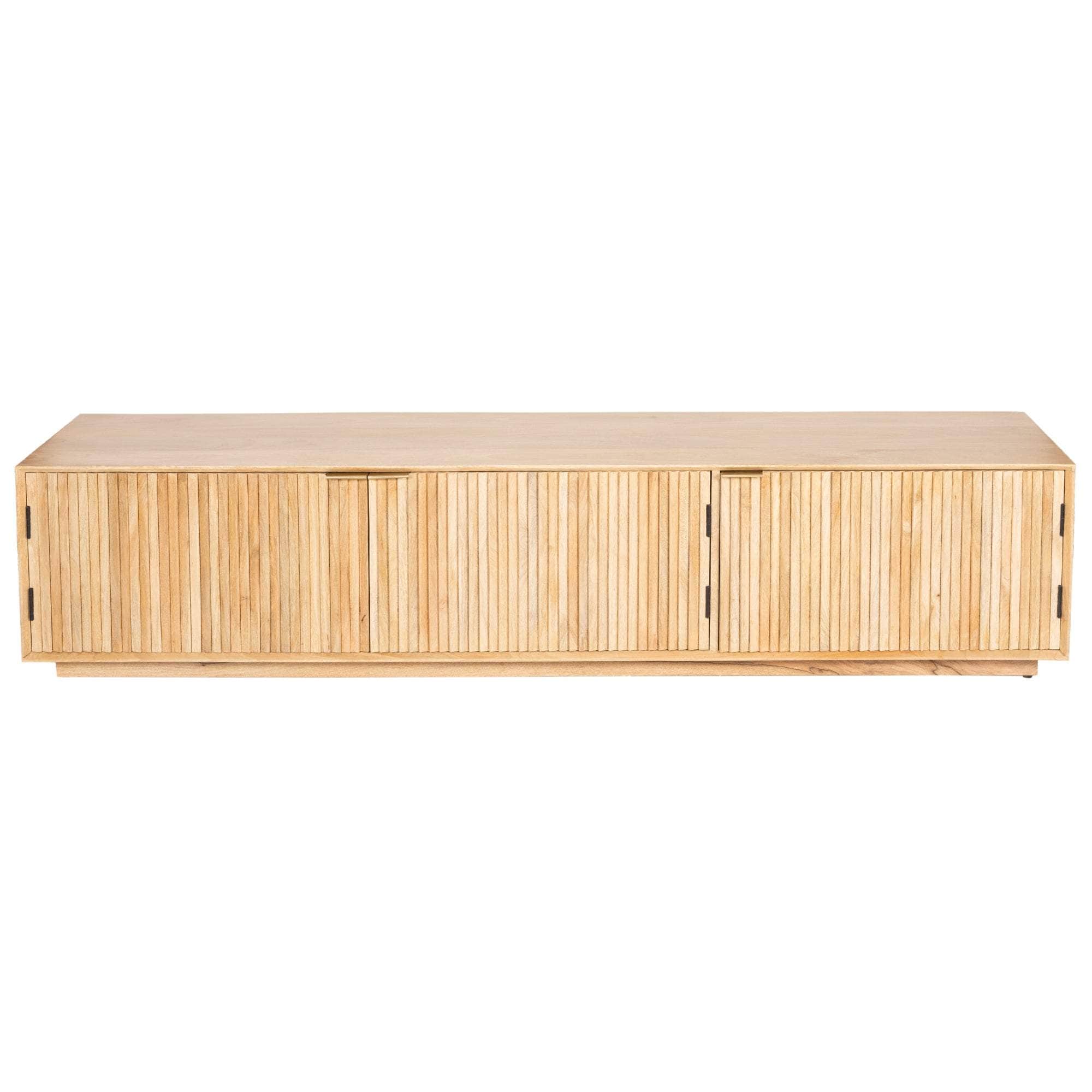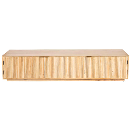 Here’s an ETU that not only looks beautiful, but also solves living area’s storage space problem to a great extent. The TV unit with 3 doors, covering spacious compartments, is a highly useful piece of furniture. It has magnetic door latches on all doors. The doors also have metal handles in gold colour. Designed in mid-century style, the natural-coloured TV unit is made of sustainably harvested MDF and mangowood and features fluted detailing. The wood provides the ETU with strength and good looks. The TV unit has robust base made of solid mangowood. A one-year warranty is included with the easy-to-assemble TV unit.