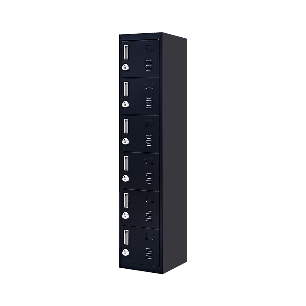 The unit measures 1800 x 380 x 450mm, and several units can be seamlessly placed side-by-side. Made with durable steel, the unit features six stacked square lockers with vents for air circulation and spaces for name tags or plates. The unit can hold up to a maximum weight capacity of 80kgs in total.