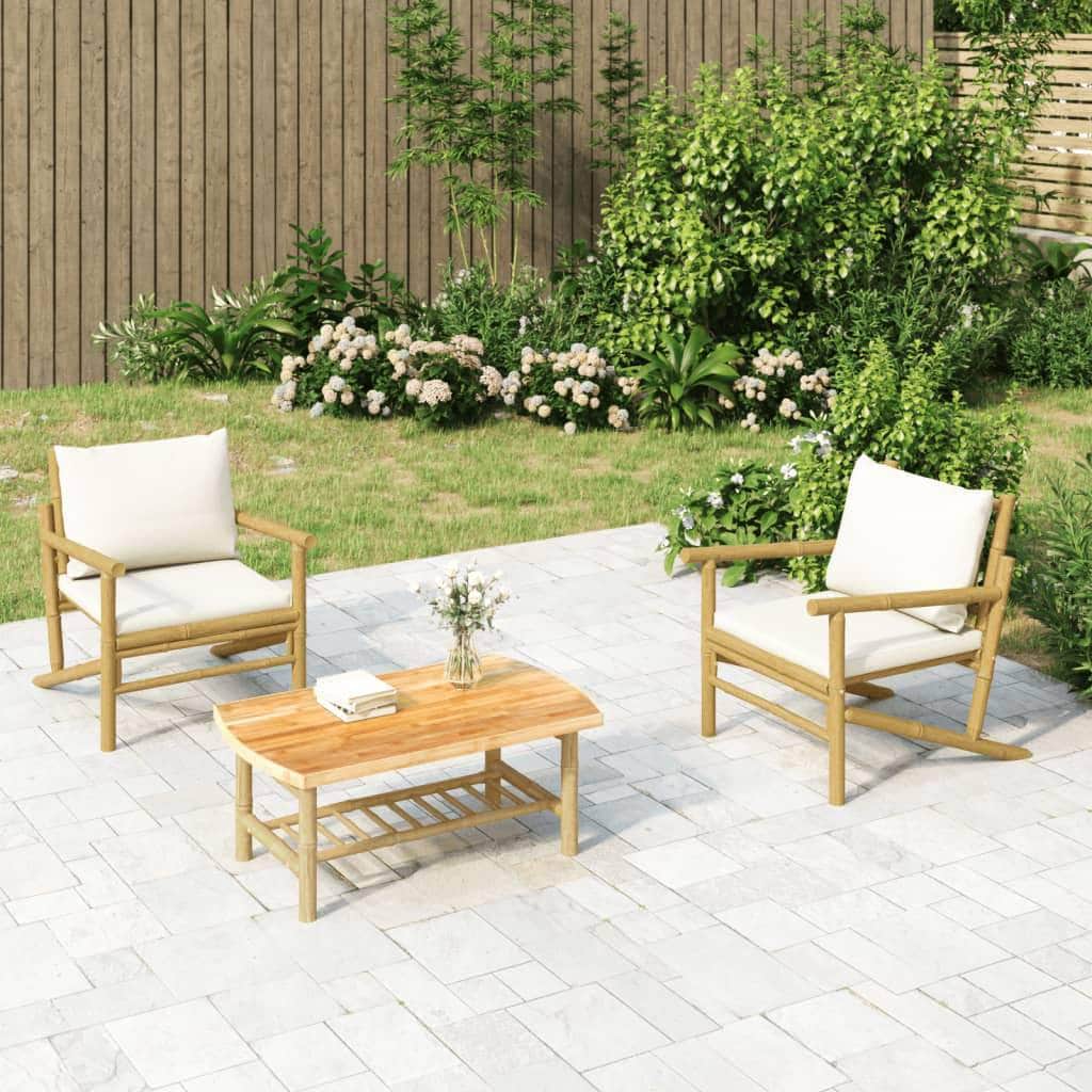 Enjoy a cup of coffee or tea in your outdoor space with this rustic bamboo garden lounge set! Bamboo set: Bamboo is known for its flexibility and hardness. Bamboo furniture is a good option when you want strong outdoor furniture made from natural materials.Comfortable seat experience: The backrest and armrests add extra seating comfort for the garden sofa set. Also, the soft seat and back cushions provide comfort for your sitting time.Practical table: The sturdy table is perfect for placing meals, drinks, and other decorative items.Modular design: The lounge set is flexible and easy to move around, so you can combine it with other modular segments in the webshop to create your own personal outdoor lounge set configurations! Note:To make sure your outdoor furniture stays beautiful, we recommend protecting it with a waterproof cover.